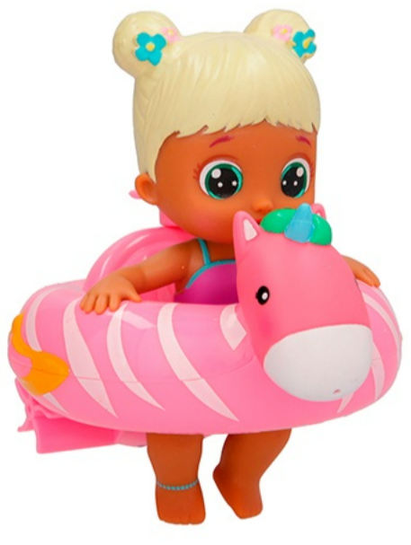 Pozwól dziecku odkrywać magiczny świat wodnych zabaw z tą uroczą laleczką do pływania! Laleczka ma jasne włosy upięte w dwa koczki z kwiatkowymi ozdobami, a jej duże, błyszczące oczy zachęcają do wspólnej zabawy. Ubrana w niebieski kostium kąpielowy, pływa w różowym kole w kształcie jednorożca z uroczym rogiem i kolorowymi detalami. To idealna zabawka do kąpieli w wannie, brodziku lub basenie – sprawi, że każda wodna przygoda stanie się jeszcze bardziej radosna!