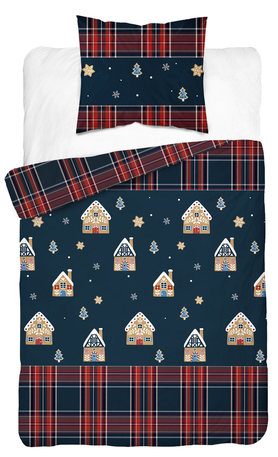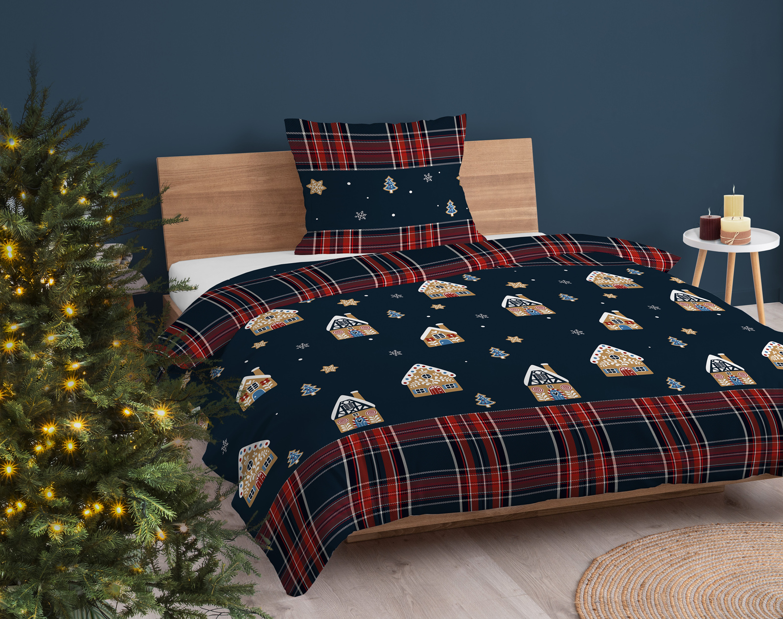 POŚCIEL ŚWIĄTECZNA ŚWIĘTA GRANATOWA DOMEK Z PIERNIKA KRATA BAWEŁNA 140X200