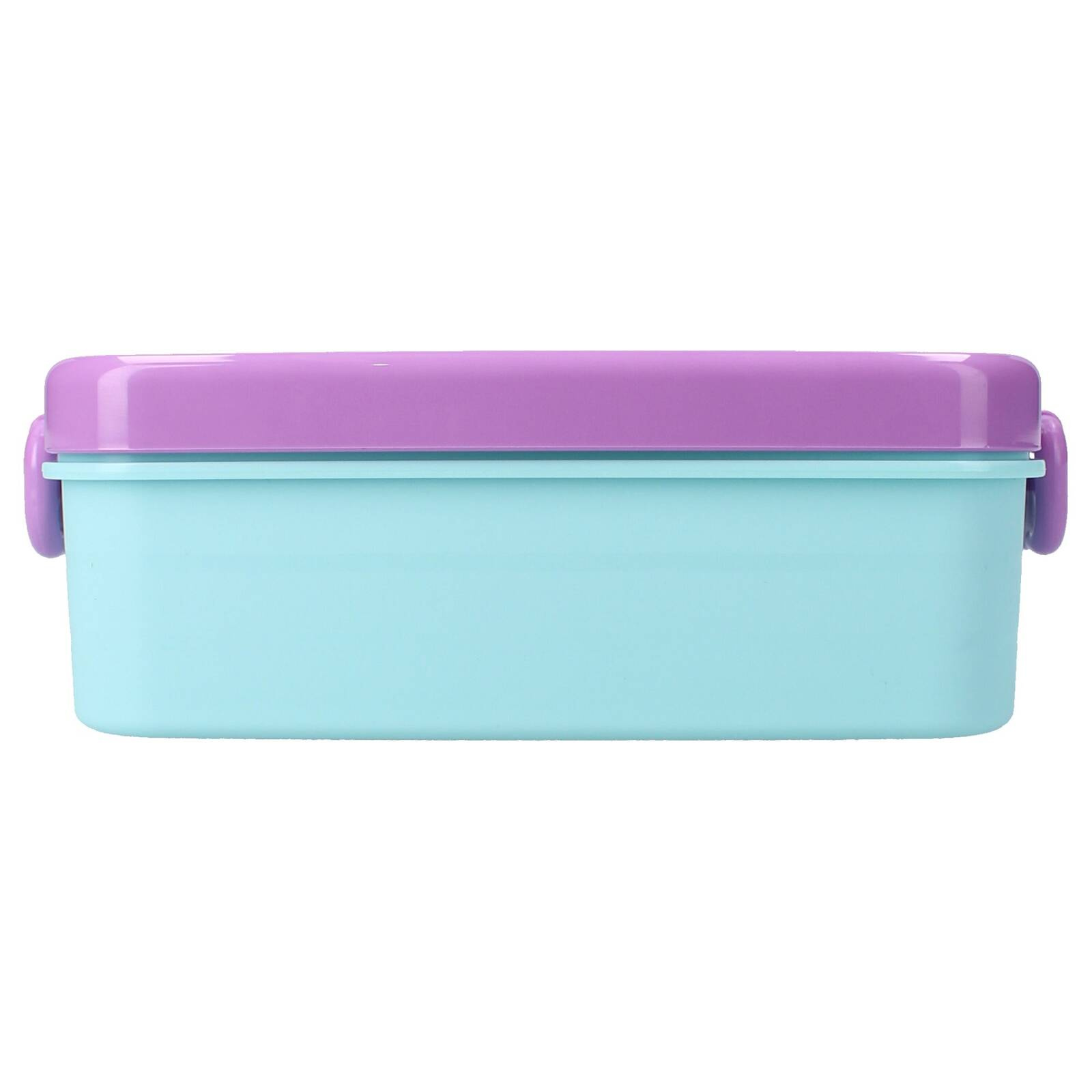 Śniadaniówka ma zdejmowaną pokrywkę i zamyka się bokami za pomocą dwóch zatrzasków.