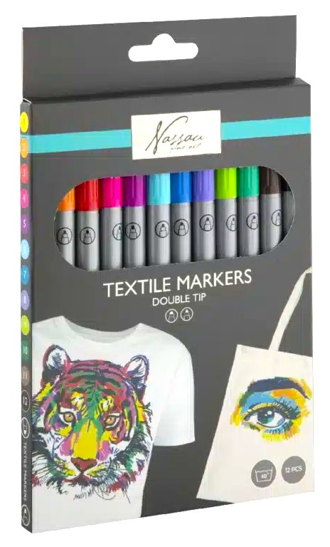 Dwustronne flamastry do tkanin – zestaw 12 kolorów marki Nassau Fine Line.