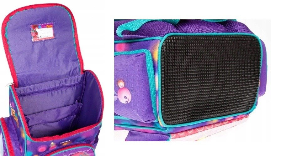 - Pod klapą tornistra, od strony wewnętrznej znajduje się przezroczysta kieszonka na wizytówkę z danymi dziecka.