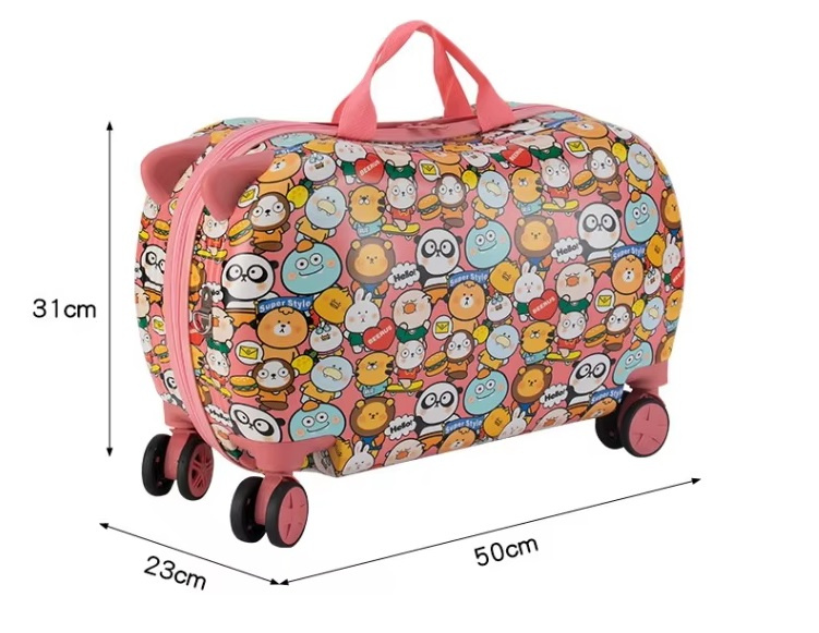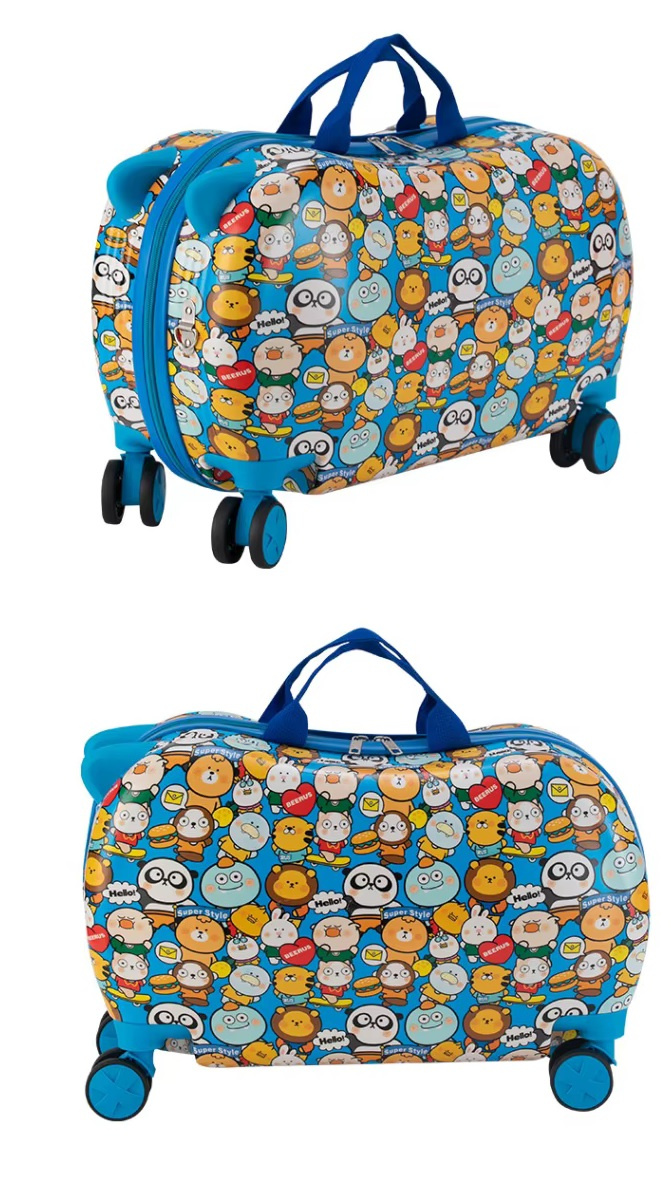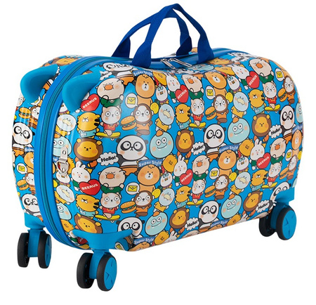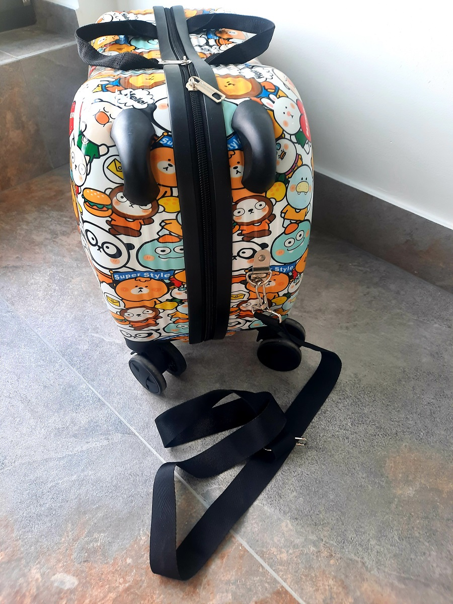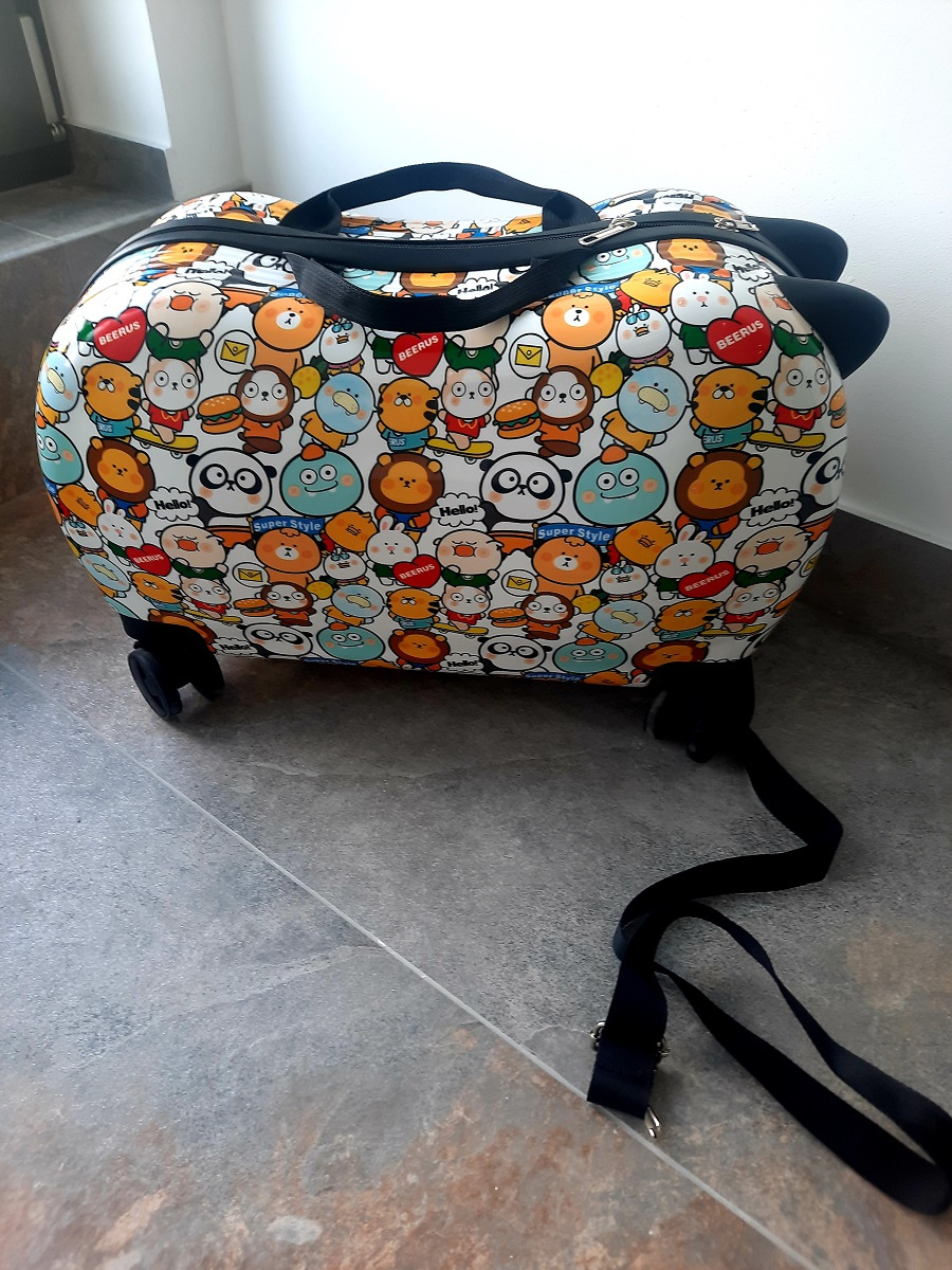 Zamień każdą podróż w magiczną przygodę z naszą uroczą walizką na kółkach w kształcie jeździka! Ten wielofunkcyjny bagaż łączy praktyczność z bajkowym designem – idealny dla najmłodszych podróżników. Walizka została ozdobiona wesołymi emotkami zwierzątek  co z pewnością przypadnie do gustu każdemu dziecku.