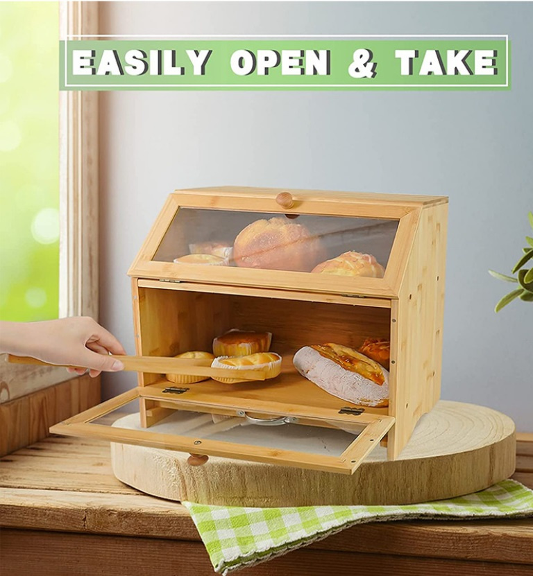 Stylowy, funkcjonalny i trwały — dwupoziomowy chlebak w kolorze naturalnego bambusu to idealne rozwiązanie dla osób ceniących porządek oraz elegancki wygląd kuchni. Jego nowoczesna forma oraz ciepła barwa drewna bambusowego świetnie prezentują się na każdym blacie.