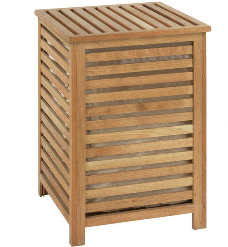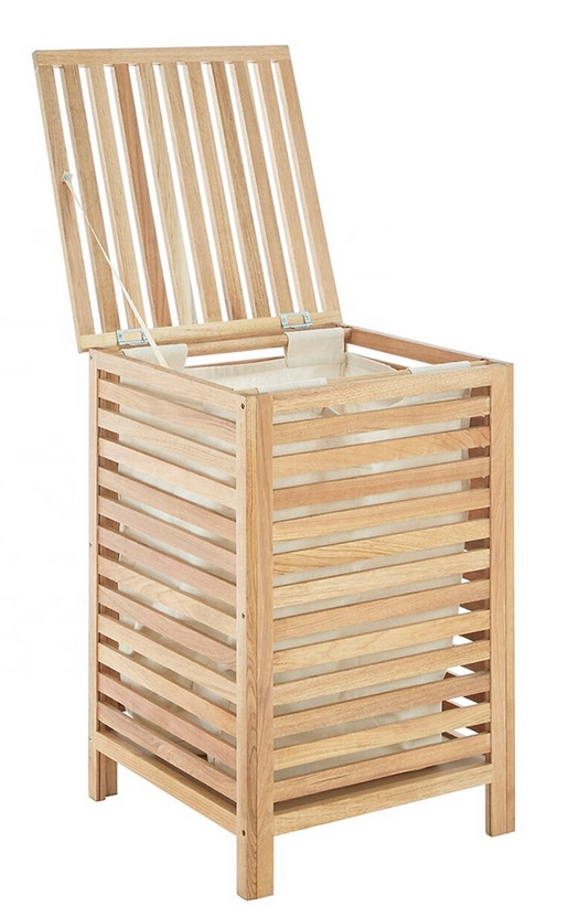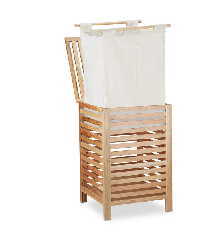 Kosz wyposażony jest w praktyczną pokrywę z wytrzymałymi metalowymi zawiasami, dzięki czemu brudna odzież pozostaje dyskretnie ukryta. Wewnątrz znajduje się materiałowy wkład o pojemności 65 litrów, wykonany z miękkiego w dotyku poliestru w kolorze ciemnoszarym. Wkład przepuszcza powietrze i można go prać w pralce, co ułatwia utrzymanie świeżości.