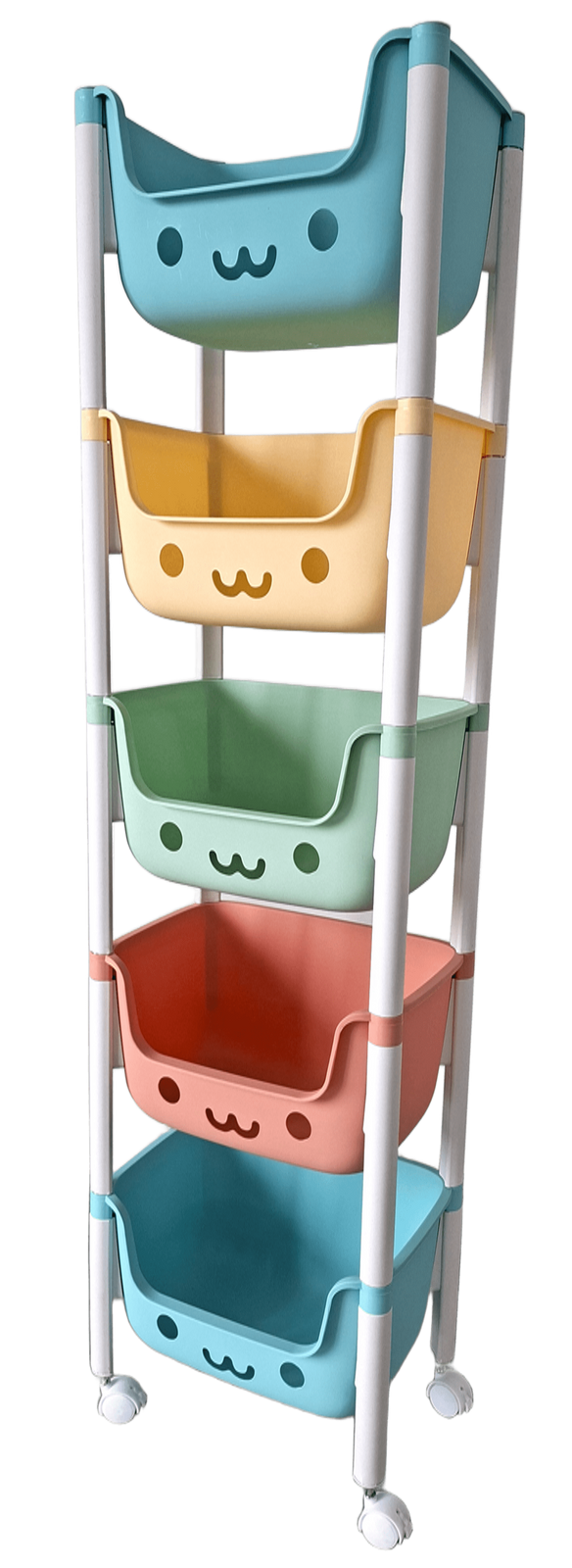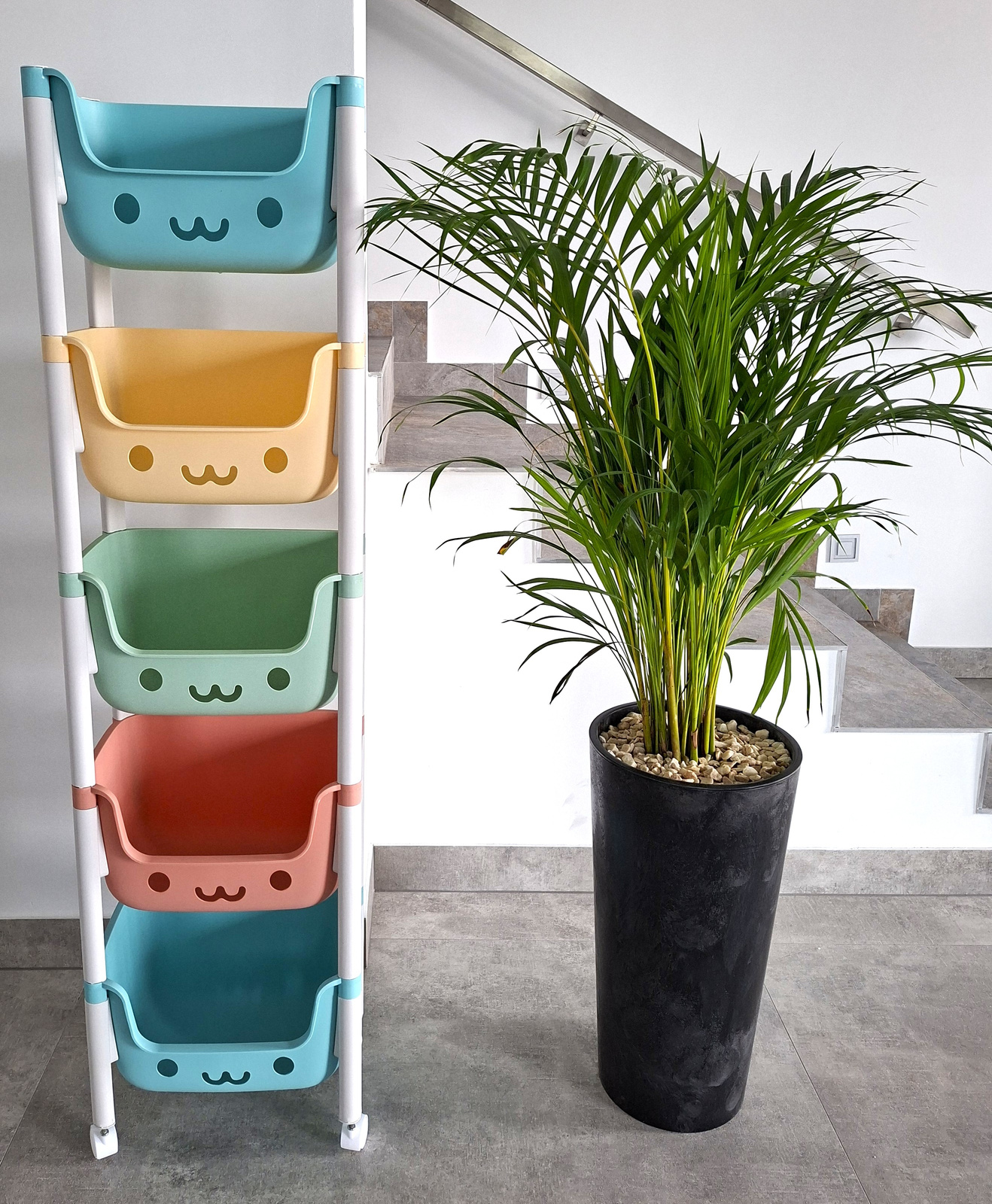 Plastikowy regał na kółkach – 5 kolorowych pojemników