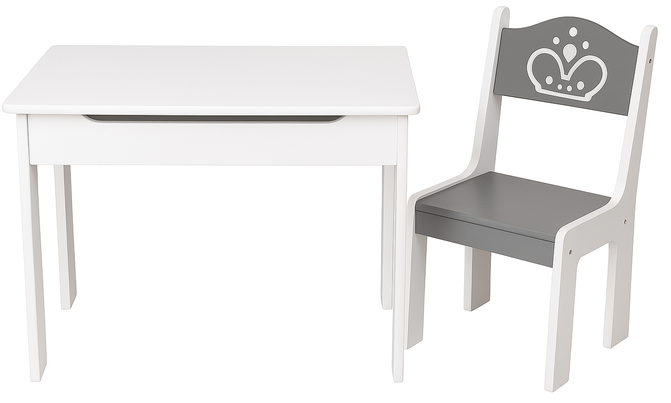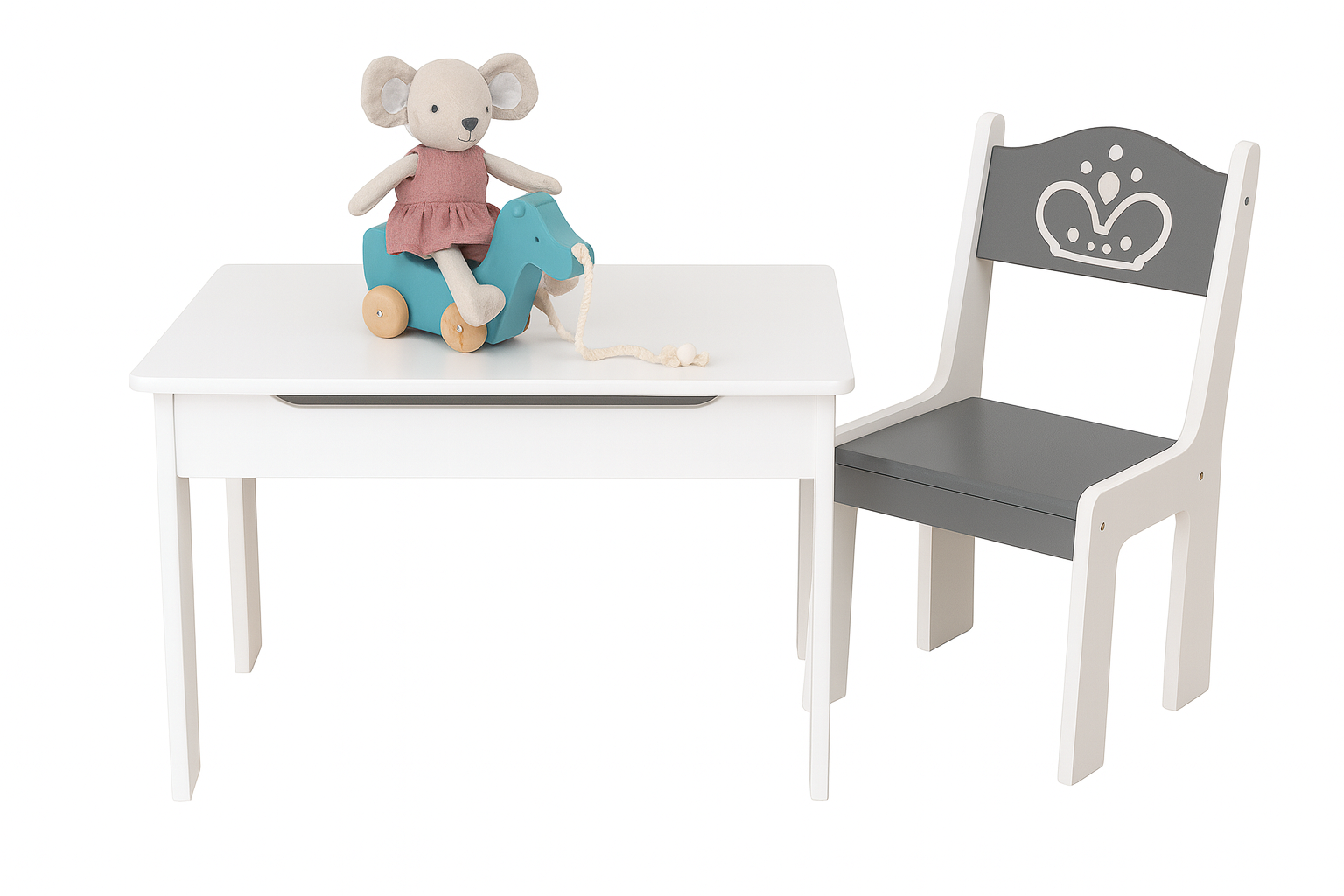 STOLIK BIAŁY SIWY DREWNIANY KSIĘŻNICZKI KRZESEŁKO ZESTAW DLA DZIECI MEBLE