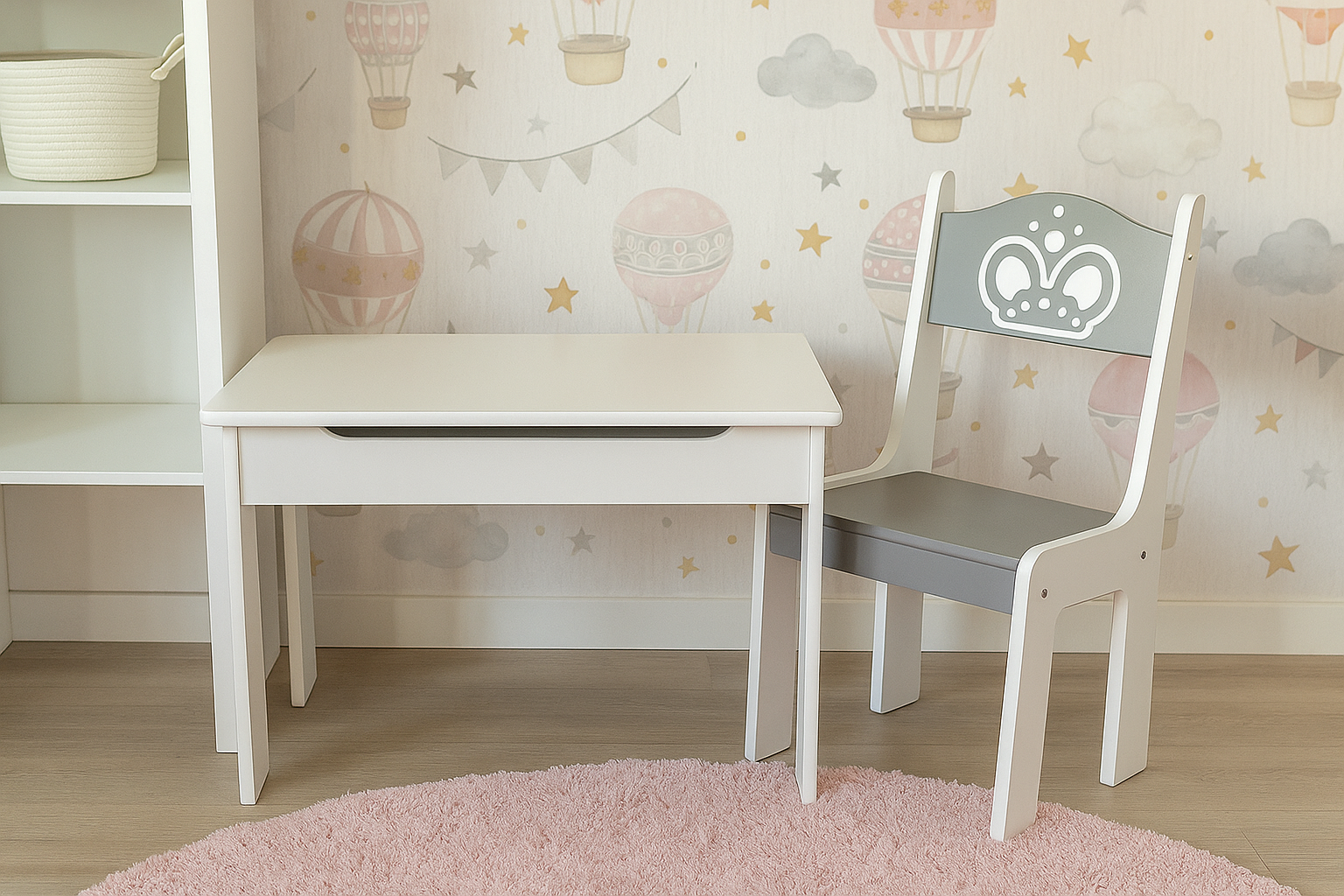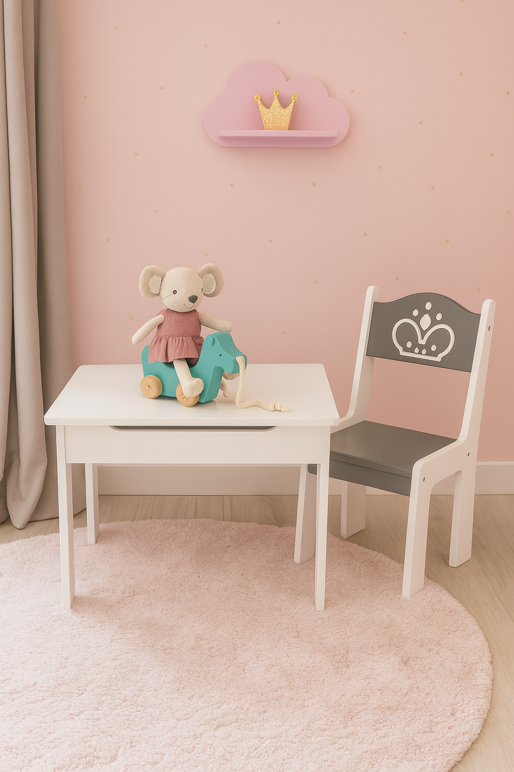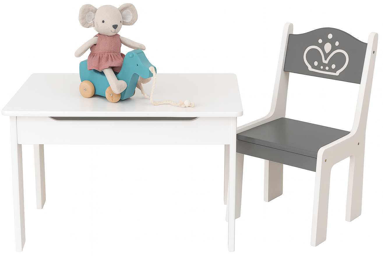 - Zestaw idealnie komponuje się w każdym dziecięcym pokoiku, może też idealnie posłużyć jako stoliczek do rysowania w dziecięcej strefie np: w biurze, gabinecie.