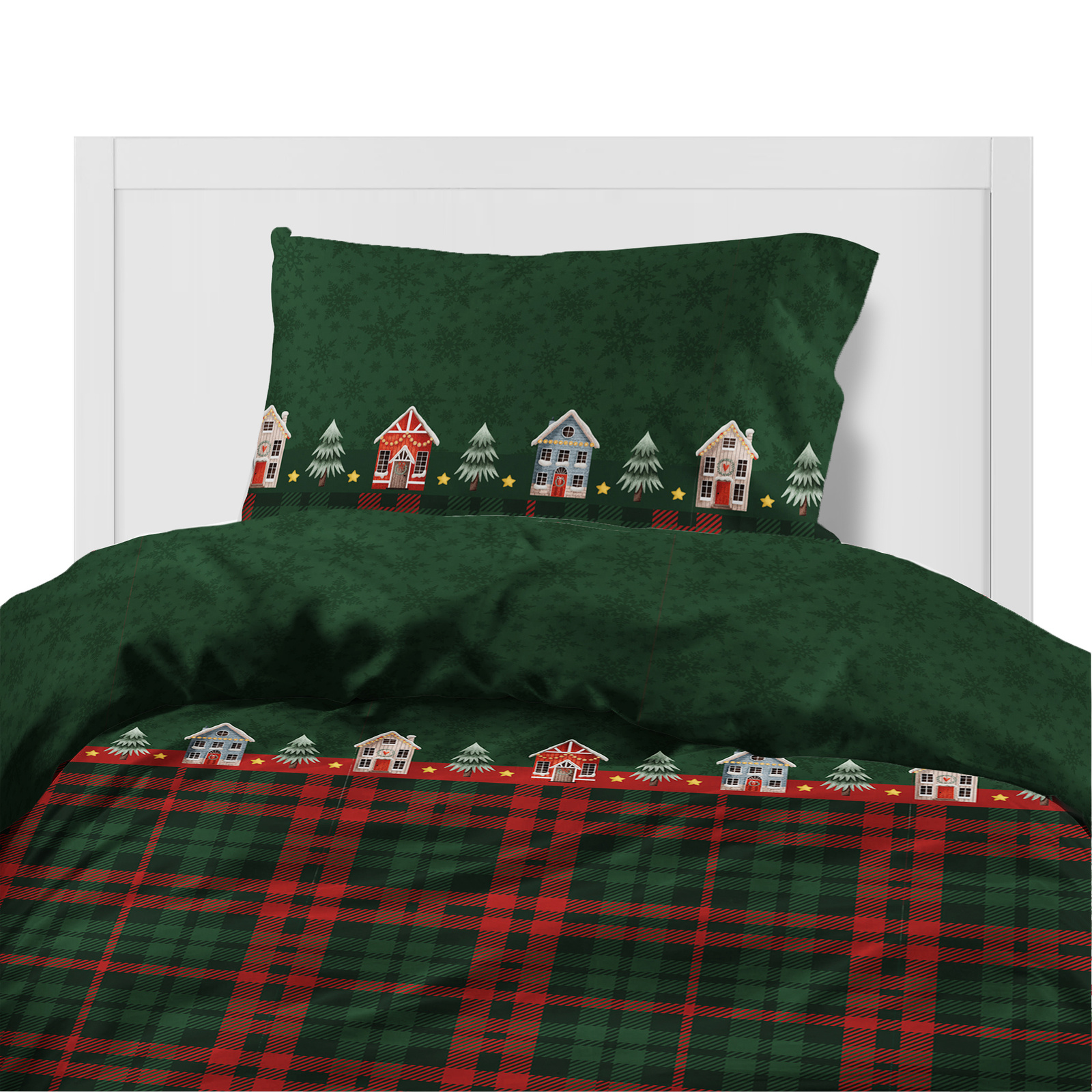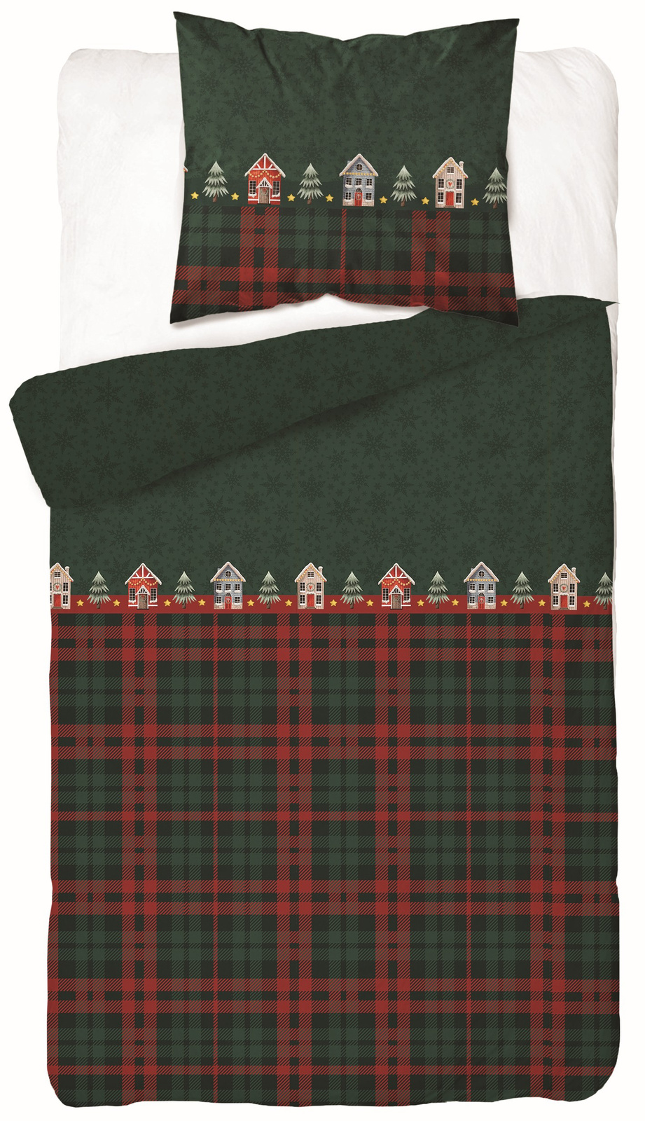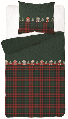 POŚCIEL ŚWIĄTECZNA ŚWIĘTA ZIELONA DOMEK KRATA BAWEŁNA FLANELA 140X200