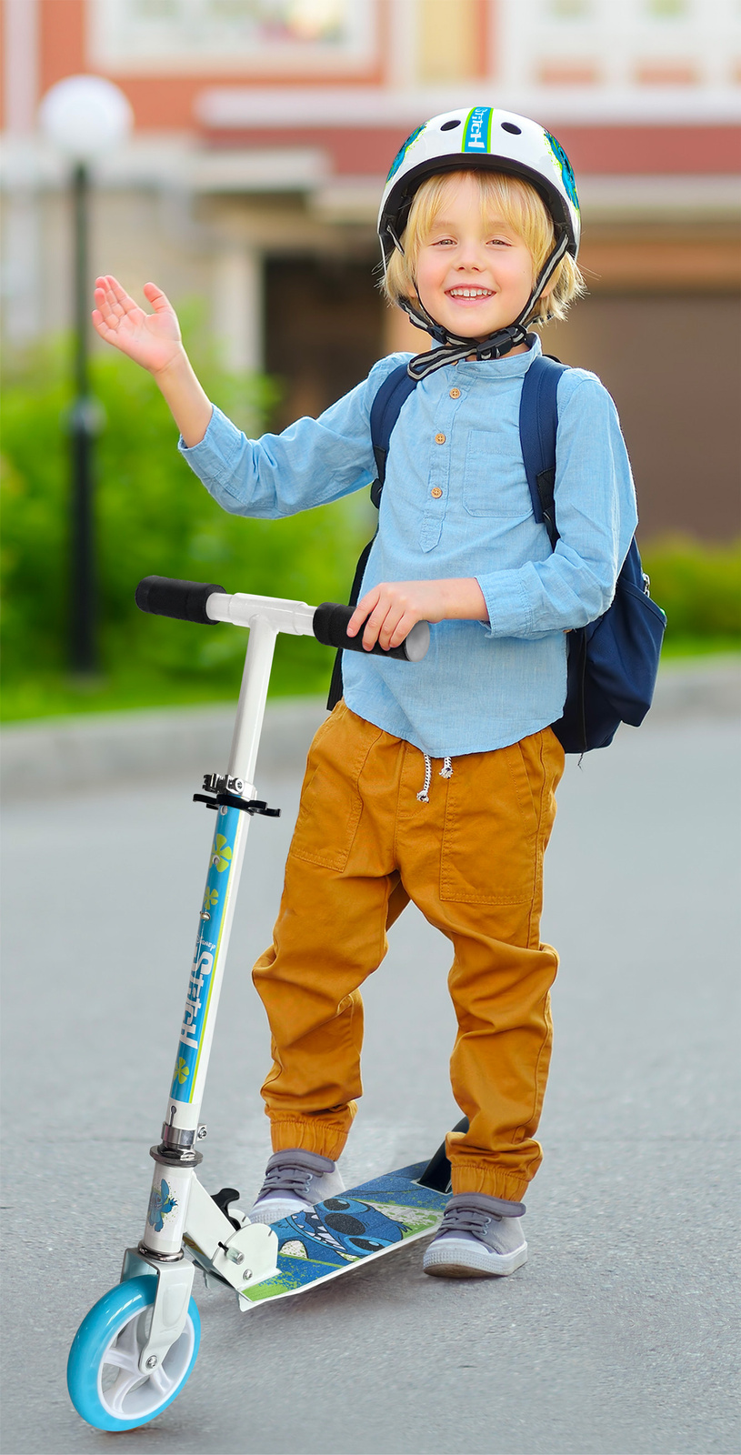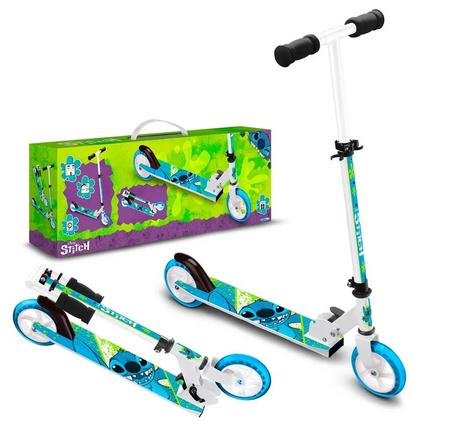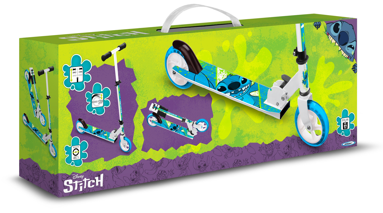 Hulajnoga Disney Stitch na dwóch kołach, w kolorystyce biało-niebieskiej. Ta składana hulajnoga jest wyposażona w tylny hamulec nożny, co zapewnia bezpieczne zatrzymanie. Rama wykonana jest ze stali, a podest z aluminium z antypoślizgową powierzchnią, co zwiększa stabilność podczas jazdy. Hulajnoga posiada 145-milimetrowe kółka z łożyskami ABEC 5, co gwarantuje płynną jazdę. Kierownica jest regulowana na wysokość w trzech zakresach: 72 cm, 77 cm i 81 cm, dzięki czemu hulajnoga "rośnie" wraz z dzieckiem. Produkt może wytrzymać obciążenie do 100 kg.