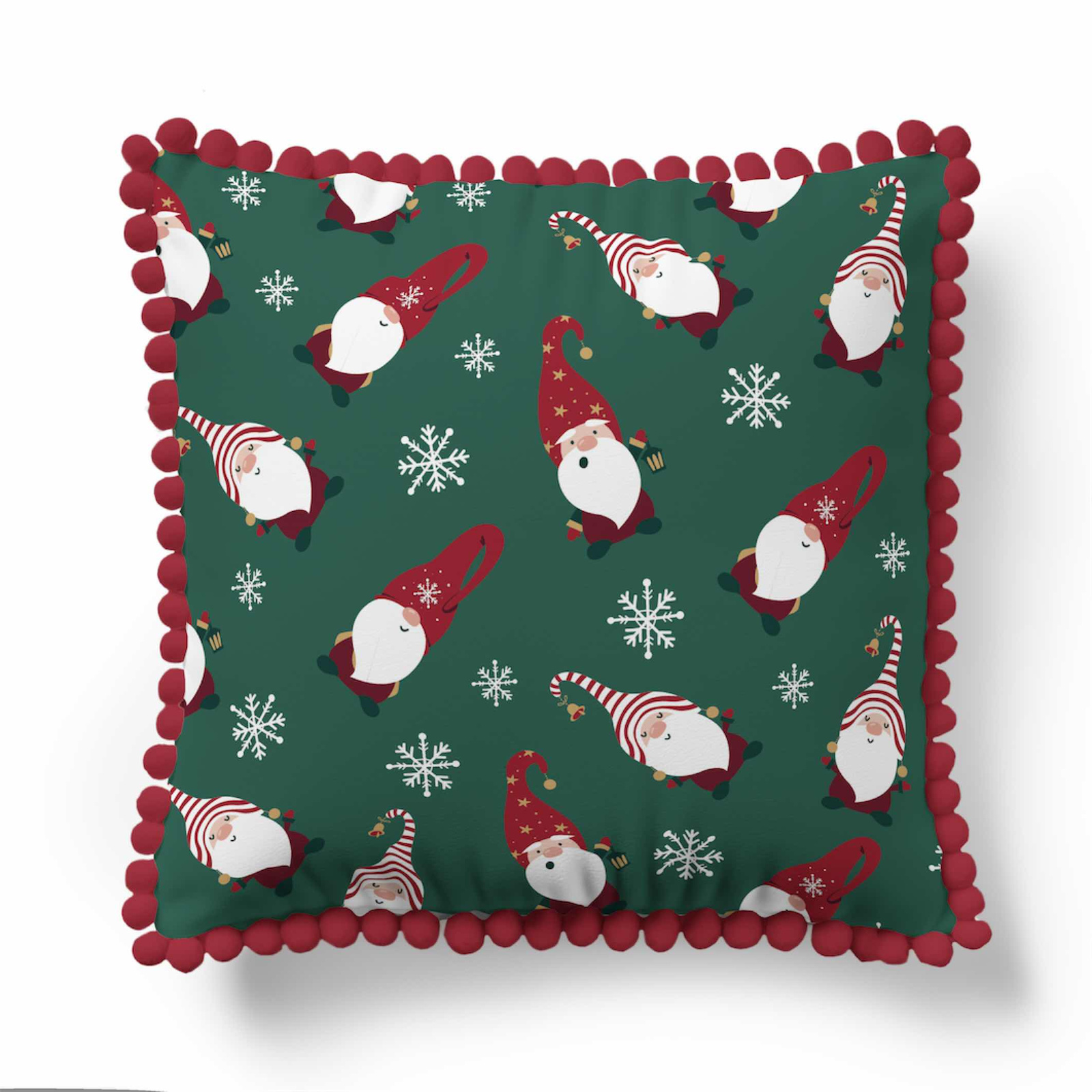 Wprowadź do wnętrza ciepłą, radosną atmosferę dzięki poszewce ozdobionej uroczymi świątecznymi skrzatami i delikatnymi płatkami śniegu. Zielone tło pięknie podkreśla zimowy charakter wzoru, a czerwone pompony wokół krawędzi dodają całości przytulnego, świątecznego akcentu.
