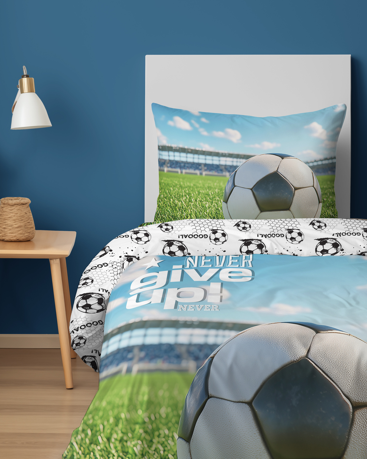 Pościel młodzieżowa 140x200 biała z piłką nożną Never Give Up Dream