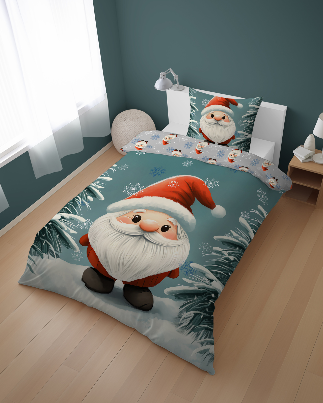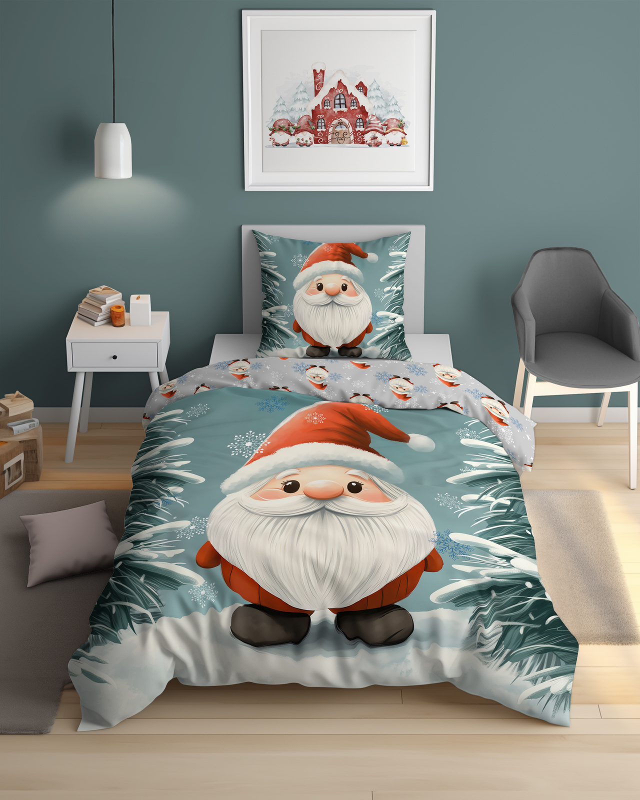 Pościel Młodzieżowa Bawełna 140x200 Świąteczna Skrzat Mikołaj Śnieg