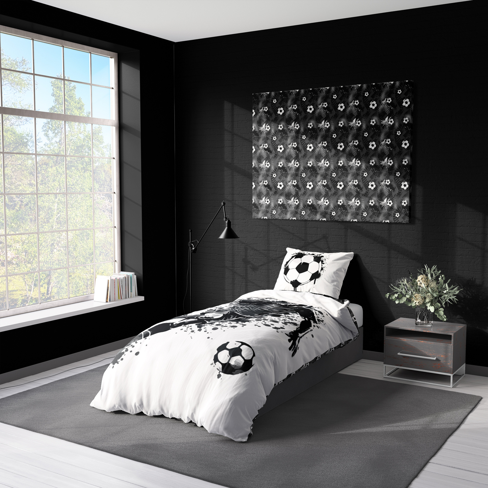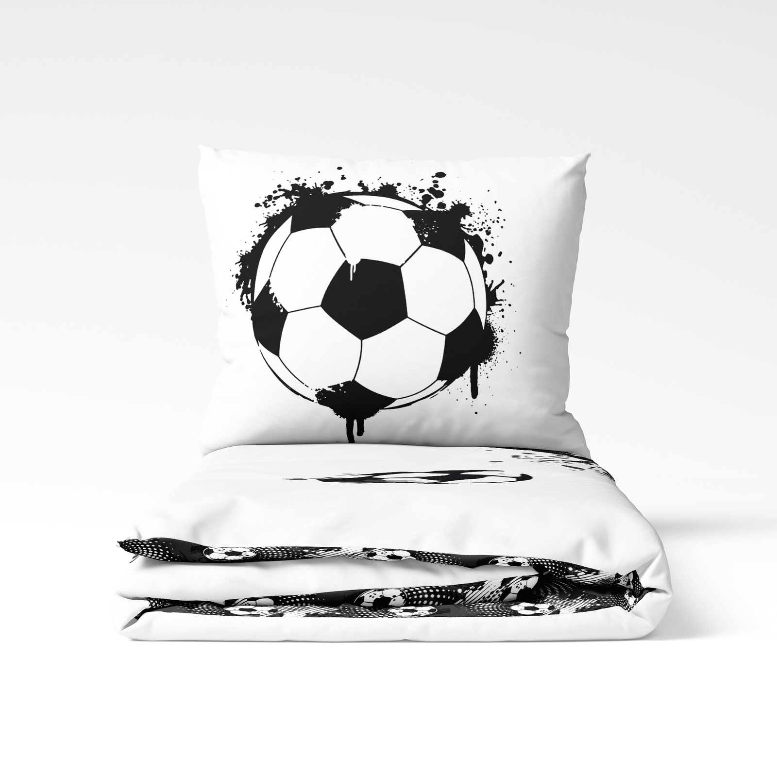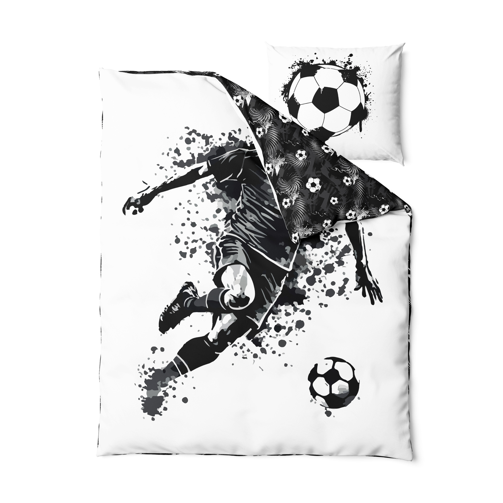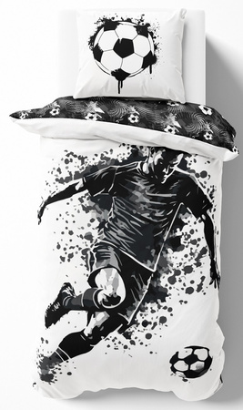 Ta pościel z dynamicznym motywem piłkarza w akcji to świetna propozycja dla wszystkich miłośników piłki nożnej. Wyrazista, czarno-biała grafika nadaje wnętrzu sportowego charakteru i świetnie sprawdzi się w pokoju dziecięcym, młodzieżowym lub u dorosłego fana futbolu.