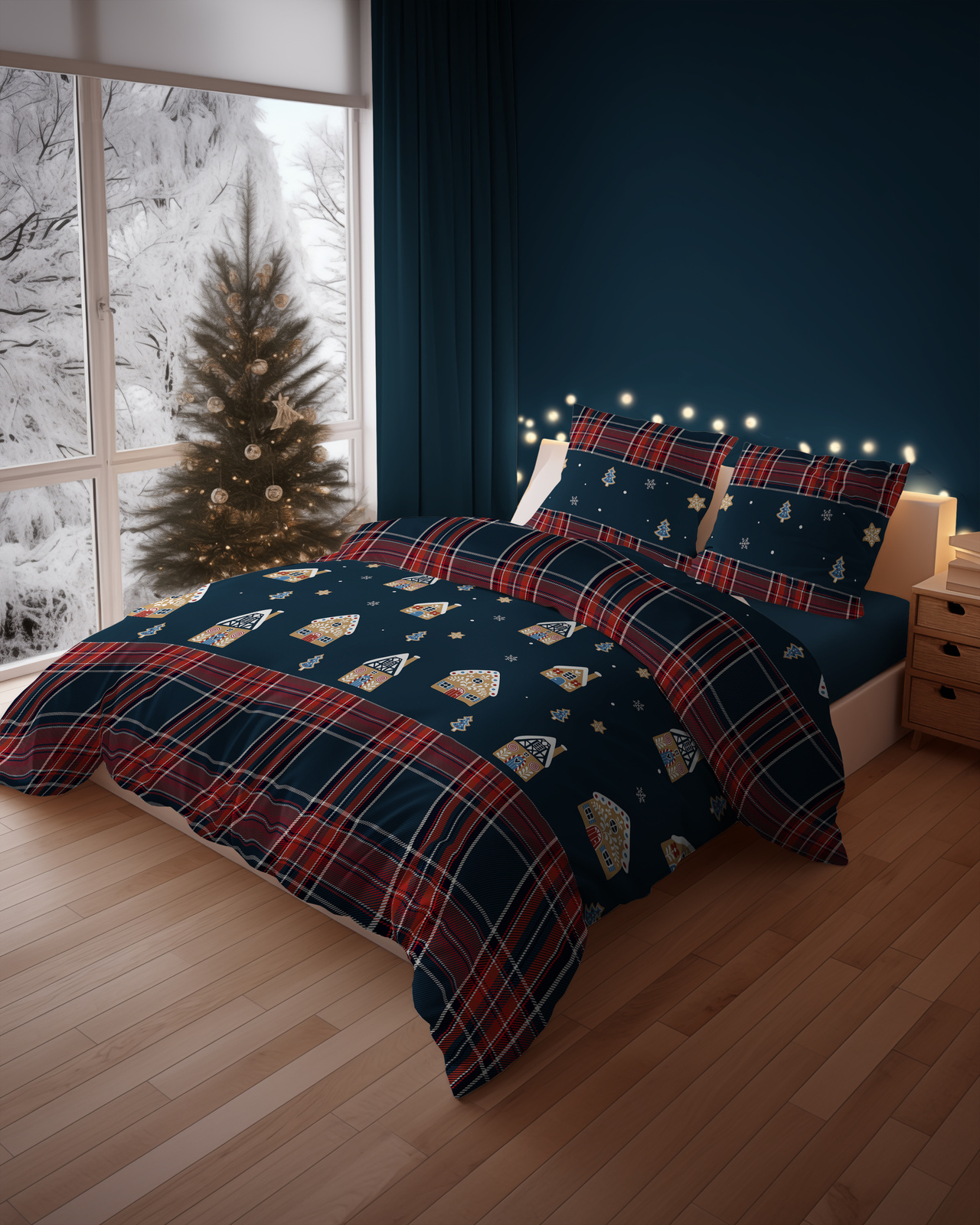 POŚCIEL ŚWIĄTECZNA ŚWIĘTA GRANATOWA DOMEK Z PIERNIKA KRATA BAWEŁNA 160X200