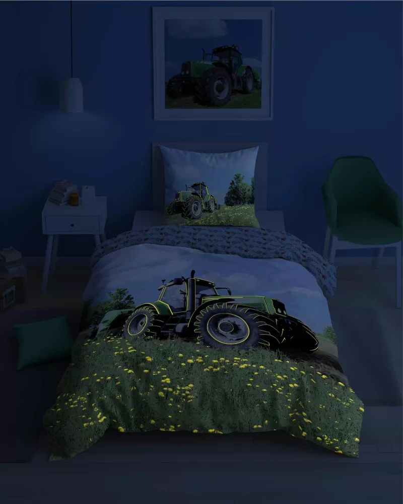 TRAKTOR WIEŚ POLE POŚCIEL ŚWIECĄCA W CIEMNOŚCI FLUO ŚWIECI DZIECI 160X200