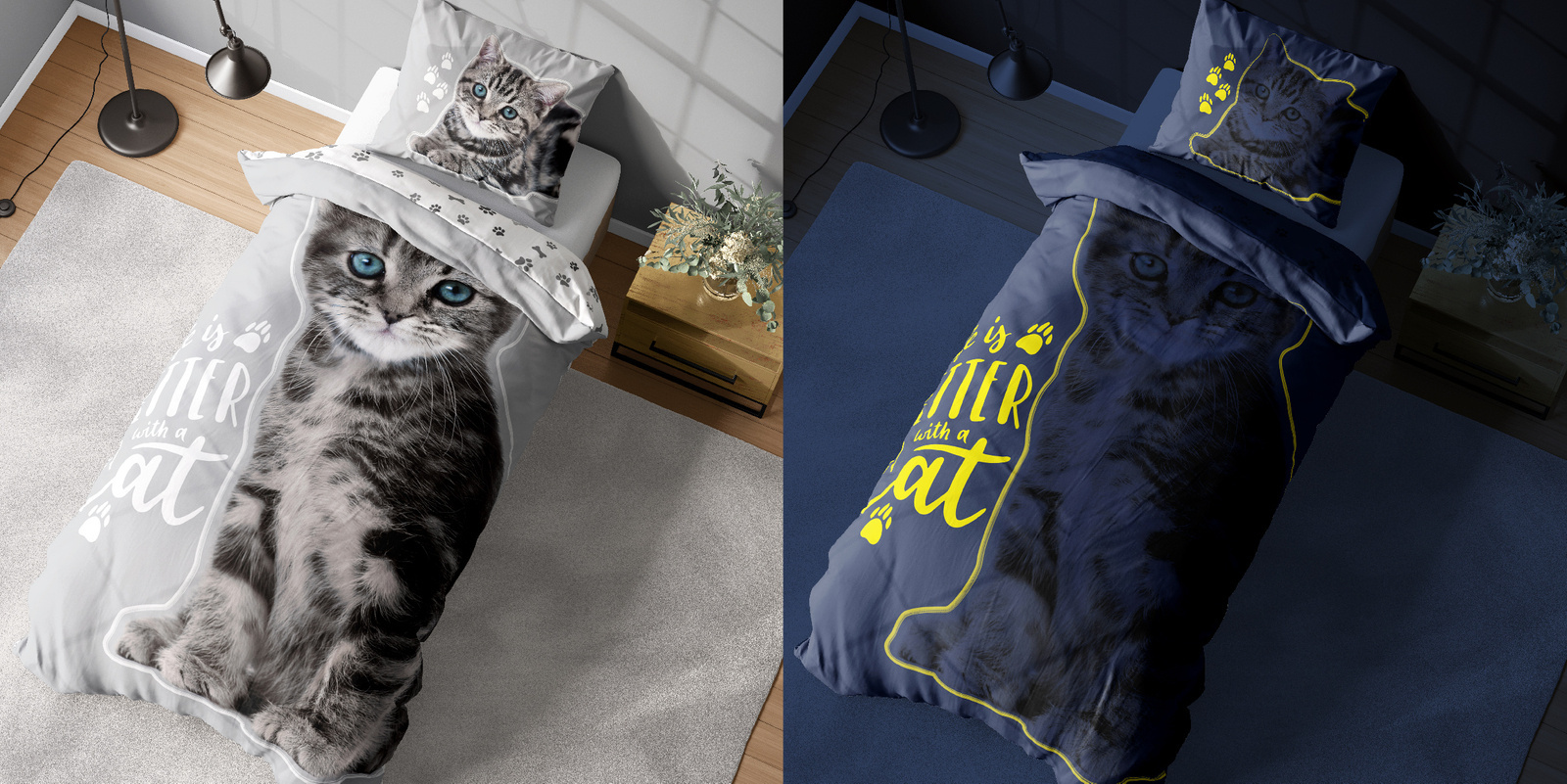 - Aby uzyskać efekt świecenia w ciemności, należy wcześniej wystawić pościel na światło dzienne lub sztuczne. Efekt świecenia zależy od czasu i intensywności naświetlania.