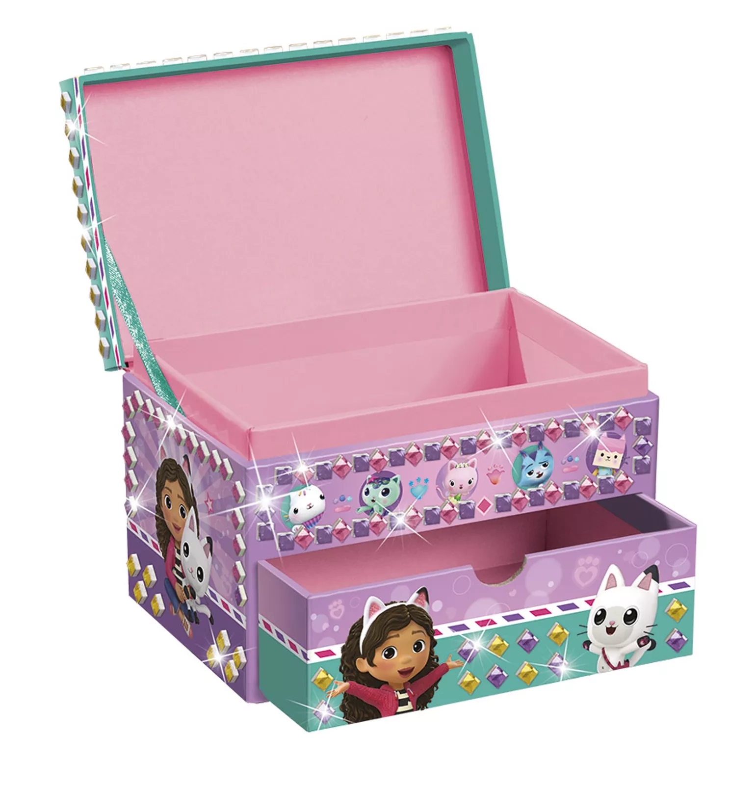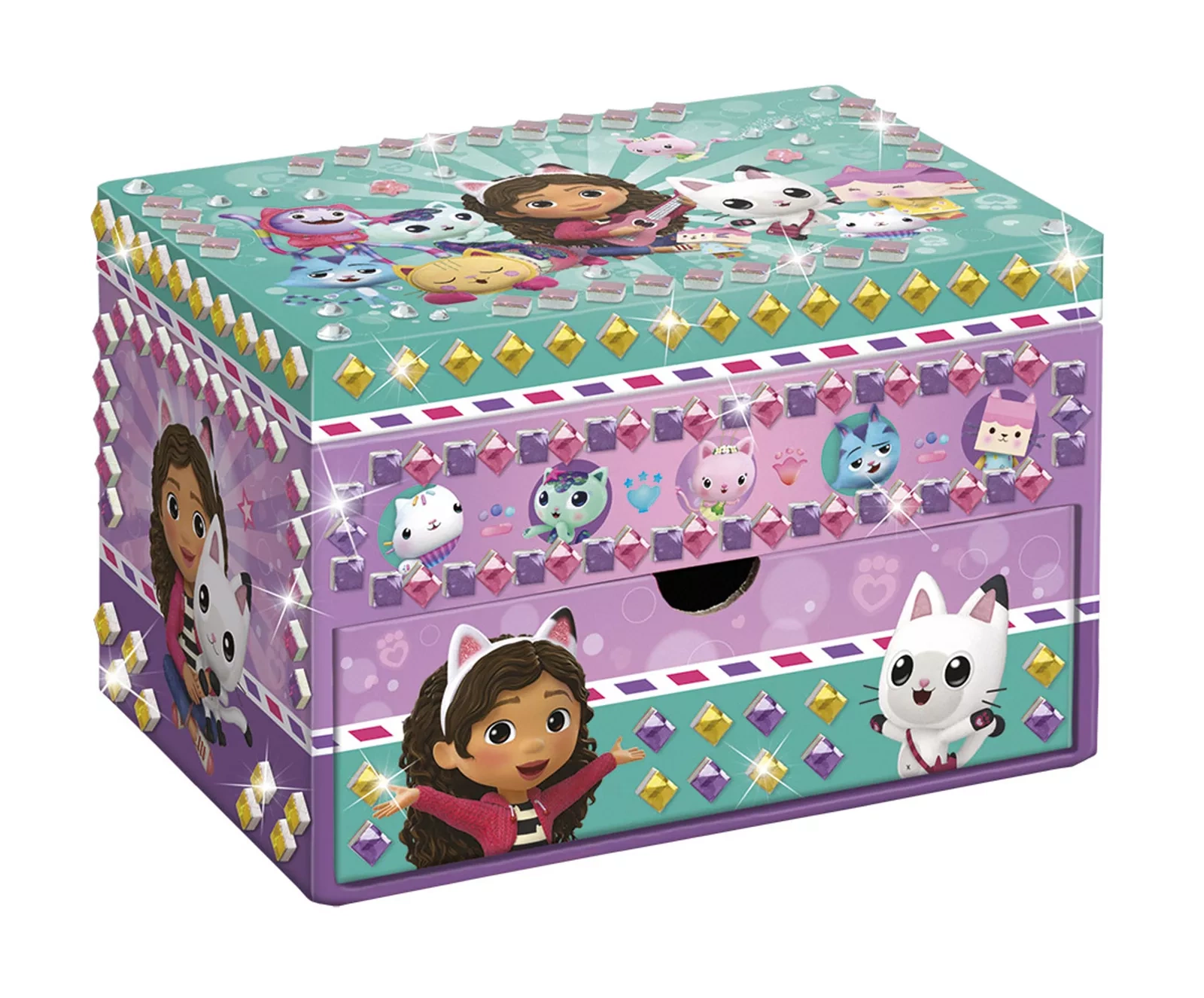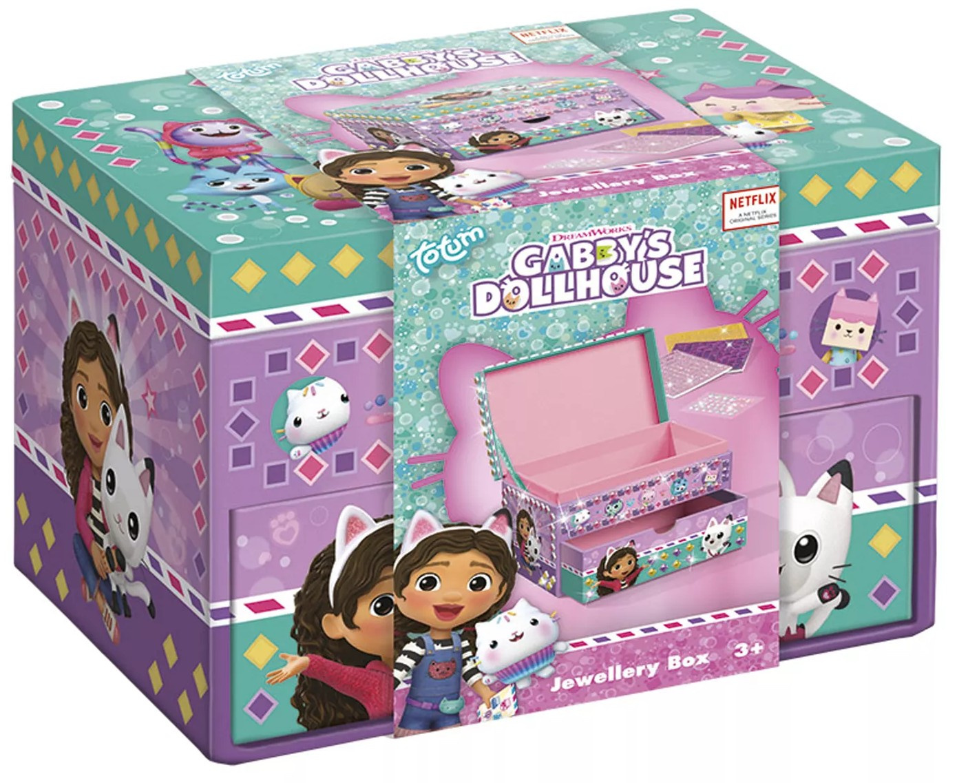 Kolorowa szkatułka z bajki Koci Domek Gabi stanie się doskonałym podarkiem dla każdej dziewczynki, która będzie przechowywać drobiazki i biżuterię. Szkatułka ma dwie przestrzenie do przechowywania - jedną w wysuwanej szufladce, a drugą pod ruchomym wieczkiem. Z zewnątrz szkatułka pokryta jest licznymi nadrukami na fioletowo-turkusowym tle - widać tutaj wizerunki Gabi, ale też Kiciusia Pandusia, Syrenkotki czy Tekturzątka.