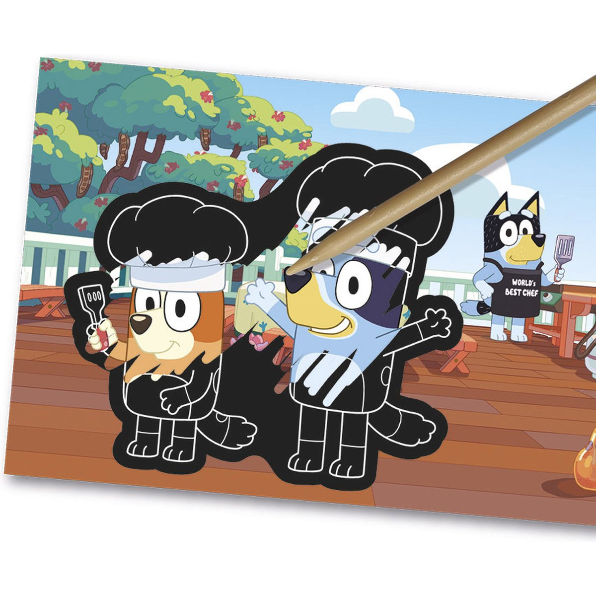 10 stron do zdrapywania z metalicznym efektem – po zdrapaniu czarnej powłoki pojawiają się kolorowe ilustracje postaci z popularnej kreskówki Bluey.