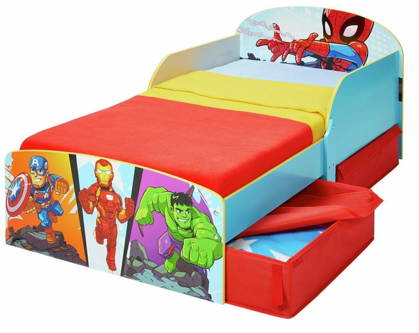 Łóżko drewniane MDF, lakierowane ze stelażem. Posiada dwie szuflady pod łóżkiem na pościel, zabawki i ubrania . Po bokach osłony dzięki którym dziecko nie wypadnie w nocy.
