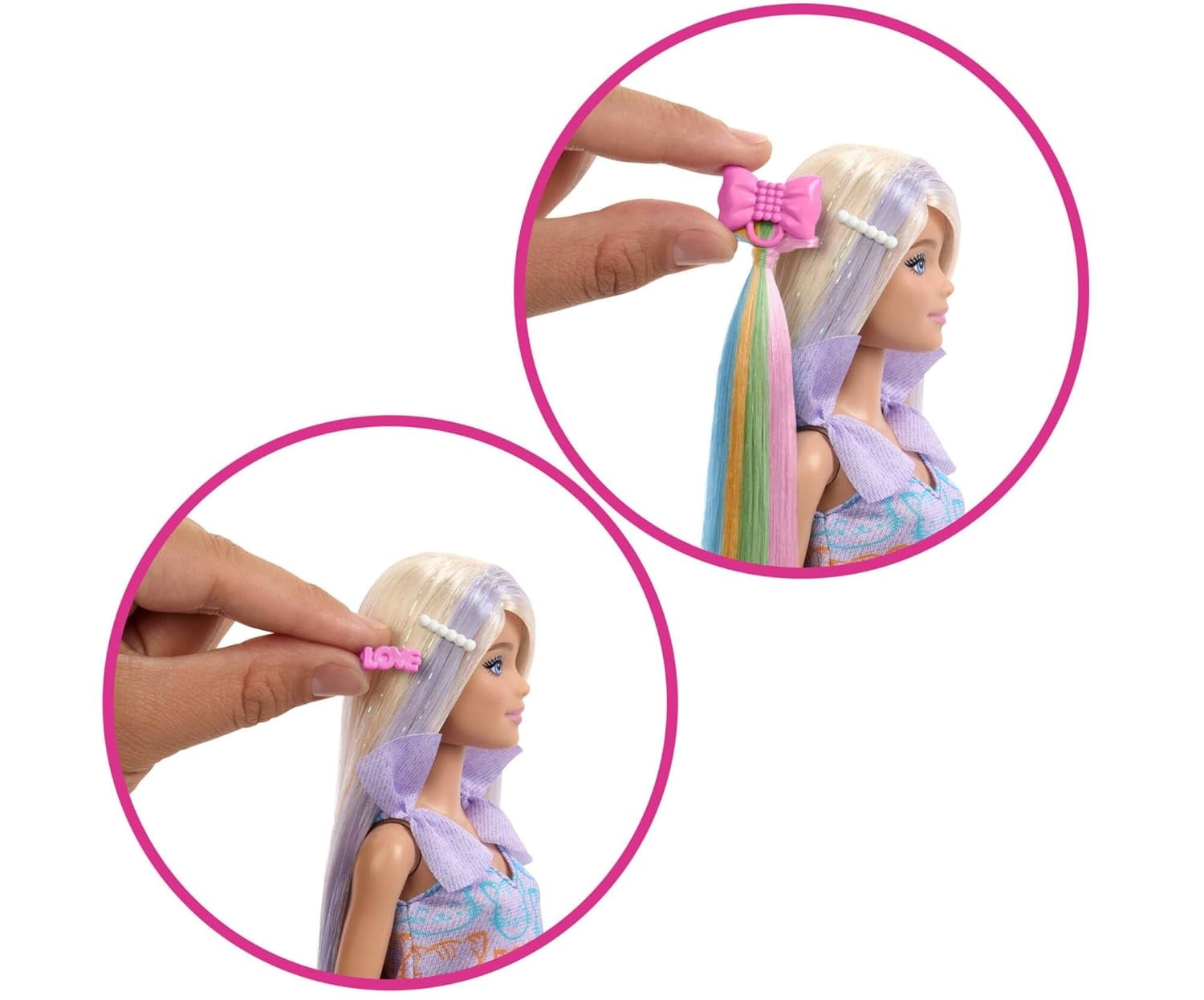 Odkryj świat kreatywnej stylizacji z lalką Barbie Zabawa Włosami! Ta wyjątkowa Barbie zachwyca bardzo długimi blond włosami (21,5 cm) z kolorowymi pasemkami oraz bogatym zestawem akcesoriów, które pozwalają tworzyć niezliczone fryzury i modowe kombinacje.