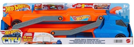 Zestaw Miejski transporter Hot Wheels City pozwala zabrać kaskaderską zabawę, gdziekolwiek chcesz! Załaduj na wielką ciężarówkę nawet dziewięć samochodzików Hot Wheels w skali 1:64 i ruszaj do Hot Wheels City, gdzie możesz do woli się ścigać i robić kaskaderskie sztuczki. Rozłóż naczepę ciężarówki, aby odsłonić mierzący ponad 76 cm długości tor wyścigowy. A dzięki wyrzutni w szoferce możesz wyjeżdżać autkami Hot Wheels z zawrotną prędkością. Rób sztuczki kaskaderskie na tylnej rampie lub pędź ku nowym przygodom, łącząc ten zestaw z innymi torami Hot Wheels.