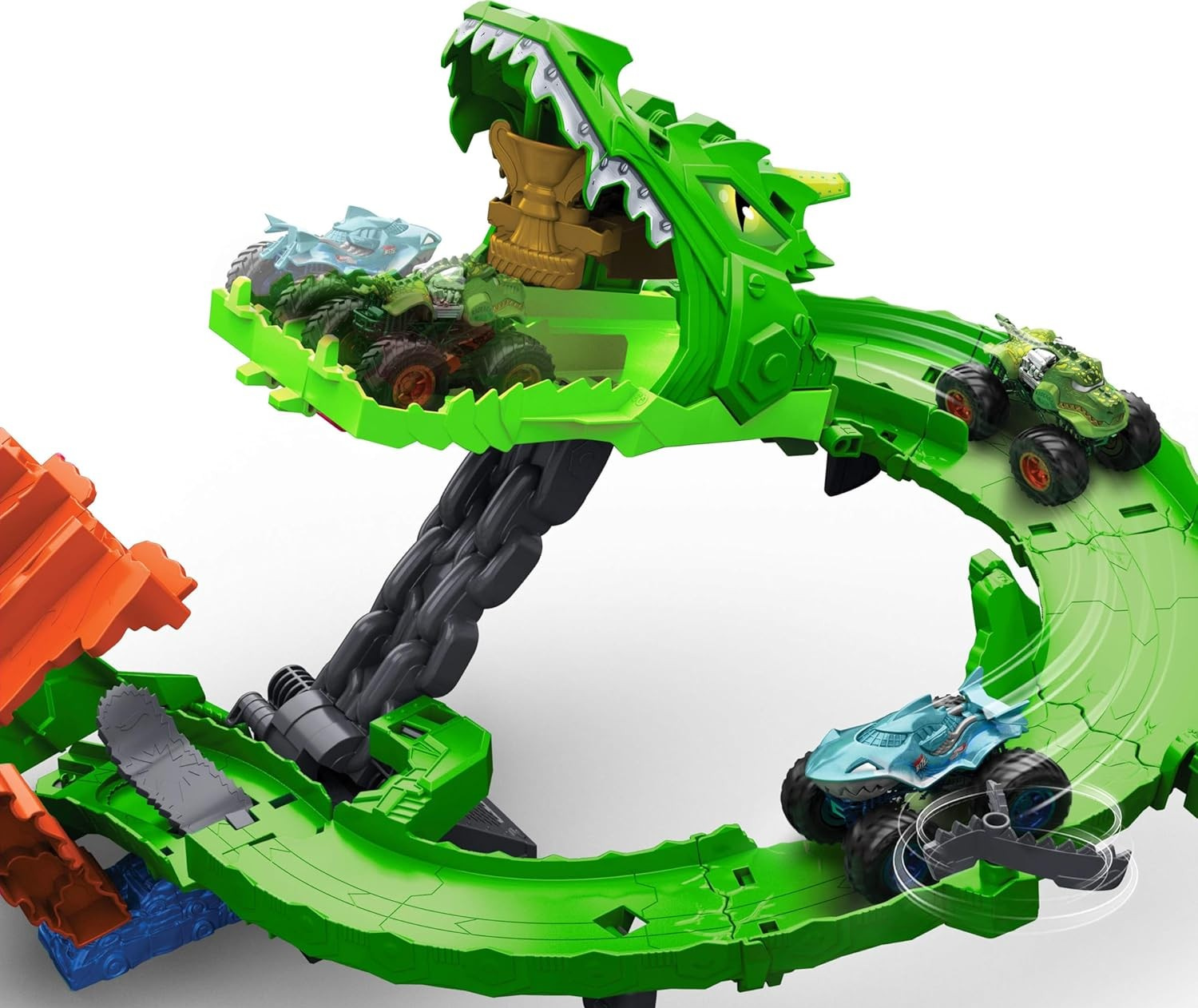 Wkracz w świat szalonej akcji z zestawem Hot Wheels Monster Trucks „Smoczy Wyścig”! Ten dynamiczny tor wyścigowy z motywem smoka-cyborga i dwoma potężnymi monster truckami to idealna propozycja dla dzieci od 4 roku życia, które kochają kaskaderską zabawę.