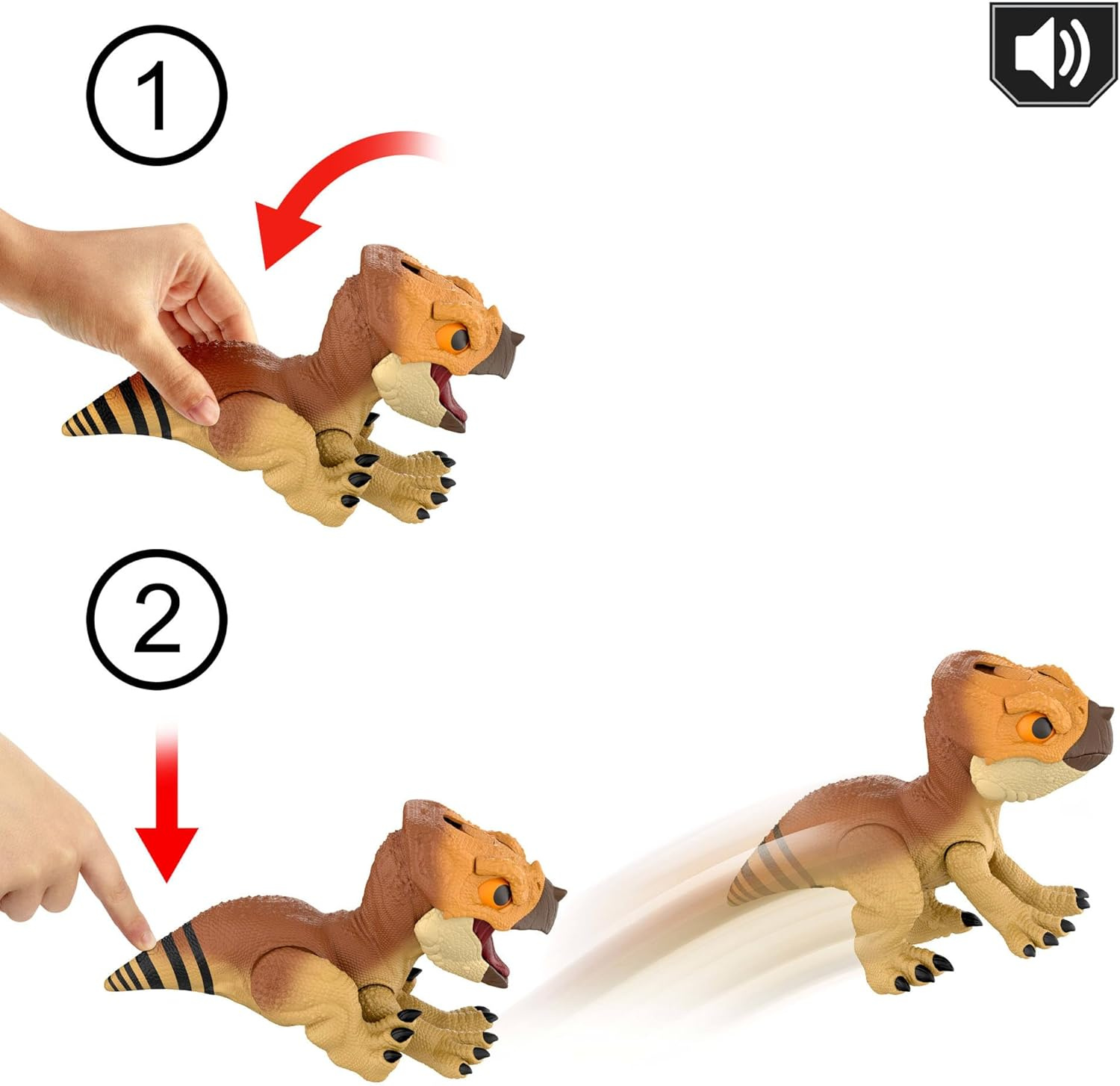 Wejdź w świat prehistorycznych przygód dzięki tej interaktywnej figurce Aquilops! Odzwierciedlająca lojalną więź między człowiekiem a dinozaurem, zabawka reaguje na dotyk, pokazywa „skok obrońcy” po naciśnięciu ogona i potrafi „schrupnąć” dołączoną lukrecjową przekąskę