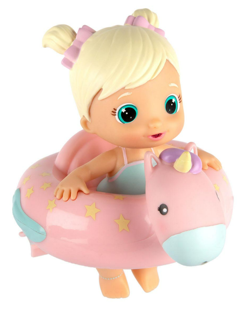 Ta śliczna lalka z blond włosami, spiętymi uroczymi kokardkami, to idealna towarzyszka do zabawy w wannie, basenie czy podczas letnich dni nad wodą. Ubrana w kolorowy strój kąpielowy i wyposażona w dmuchane koło w kształcie różowego jednorożca z kokardką, zachwyca swoim słodkim wyglądem i dużymi, błyszczącymi oczami.
