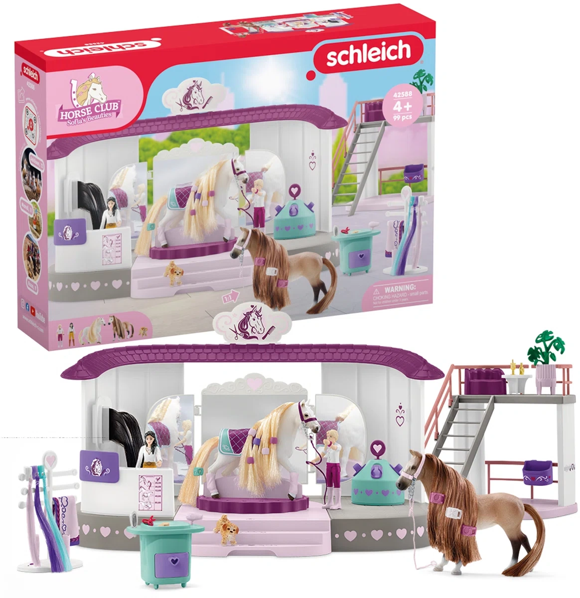 Opcji zabawy jest mnóstwo! Od przyjęcia w stadninie, przez urodziny ulubionego wierzchowca, aż po pierwszy dzień w szkole dla młodego źrebaka — Salon Piękności Schleich HORSE CLUB Sofia's Beauties ma wszystko, czego potrzebuje każdy opiekun stadniny. Dzięki tej wyjątkowej pracowni możesz idealnie dopasować każde akcesorium do nowego stylu. Źrebaki, sportowe kucyki, a nawet dostojne ogiery mogą dumnie prezentować swoje nowe stroje na specjalnym podium. Pod spodem znajdziesz praktyczną szufladę na wszystkie dodatki do stylizacji — od spinek po koraliki.