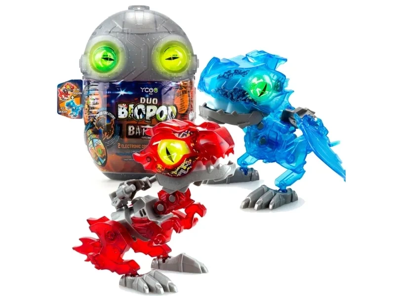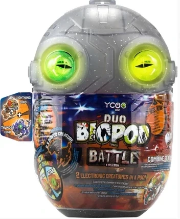 Silverlit BIOPOD JAJKO Dinozaury BATTLE DUO Odbezpiecz tajemną kapsułę i sprawdź co kryje się w jej wnętrzu! Poznaj kolejną odsłonę BIOPOD. Zestaw battle duo pozwala na zbudowanie z pojedynczych części aż dwóch elektronicznych stworów. Możesz także puścić wodze fantazji i elementy z obu stworów połączyć w jedną BIOhybrydę! Potrzyj twarze robotów i obserwuj ukryte na nich wzory, kolory oraz tajny kod. BIOPOD battle duo dostępne są w różnych wzorach, przekonaj się, na które stwory trafisz! Zabawka przeznaczona jest dla dzieci od 5 roku życia. Cechy produktu: zestaw pozwala na stworzenie 2 elektronicznych stworów, możliwość zbudowania jednego stwora, będącego hybrydą, złożoną z elementów pochodzących od dwóch postaci, różne wzory sprzedawane losowo, wiek: 5+,baterie: do jednego robota 2 x LR44 (zawarte w zestawie).