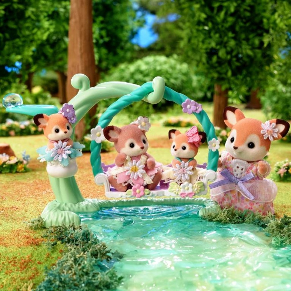 Rodzina jeleni ma duże uszy. Ten zestaw zawiera szczeniaka jelenia i niemowlęta w sukienkach kwiatowych pasujących do siebie z huśtawką bluszczu i łóżeczkiem konwalii. Dzieci mogą siedzieć na huśtawce w pobliżu wody lub w łóżeczku konwalii. Postacie mają różne kolory i wzory uszu! Niemowlęta są karmelowe w kolorze karmelowym, a dziecko ma kolor kakao z płatkami uszu. Dostępne są dekoracje uszu z kwiatami i motylami, które mogą nosić dla dzieci. Dzieci mogą również usiąść na liściu, na którym znajduje się przezroczysta kropla wody.
