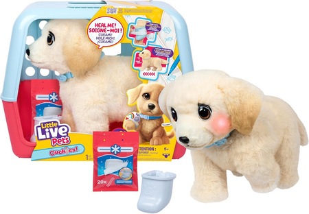 Little Live Pets Ouchies Puppy Cooper, Interaktywna pluszowa zabawka od marki Moose Toys. Jest to uroczy szczeniak, który pozwala dzieciom wcielić się w rolę weterynarza, oferując realistyczne doświadczenie opieki nad chorym pupilem.