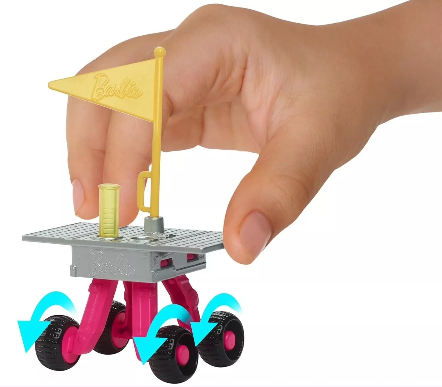 Lalka Barbie® Astronautka ma na sobie kombinezon kosmiczny z kultowymi detalami, a w zestawie znajdziesz też 10 akcesoriów tematycznych, w tym hełm z ruchomą osłoną i innym „widokiem” oraz łazik kosmiczny na kółkach.