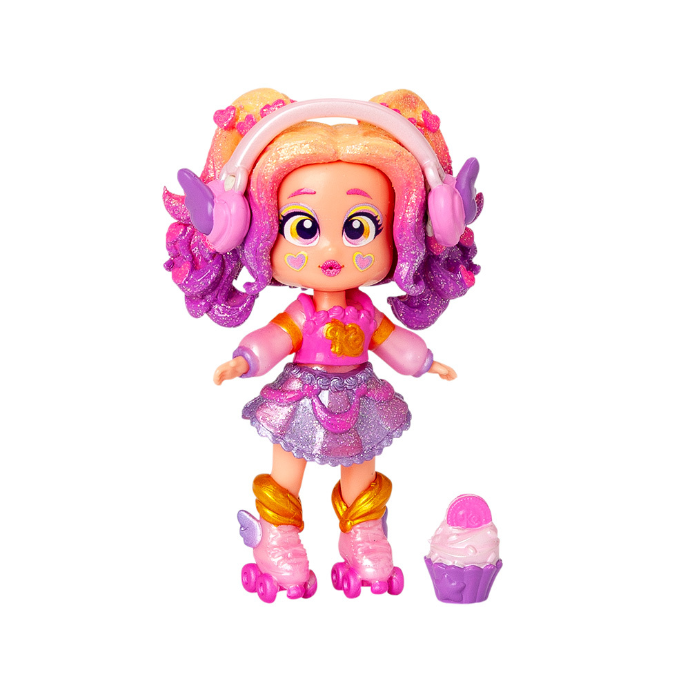 Brokatowa fryzura Cupcake Dreams mieni się niczym cukrowa posypka, a trzy wymienne wyrazy twarzy pozwalają dopasować jej nastrój do zabawy.