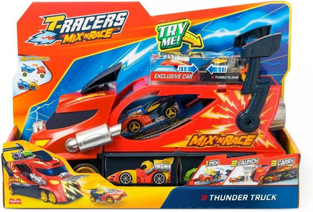 - ODKRYJ MOC THUNDER TRUCK! - Z T-Racers Mix ́N Race Thunder Truck, 3 akcje w 1 pojedynczym pojeździe! ¡1! Umieść swój T-Racer Mix ́N Race w strefie Mix 'N Race, aby połączyć części i załadować je do wyrzutni. ¡2! Naciśnij, aby uruchomić z pełną prędkością 3! Zaparkuj swoje pozostałe T-Racers Mix ́N Race w środku, gotowe do ścigania się, kiedy tylko chcesz