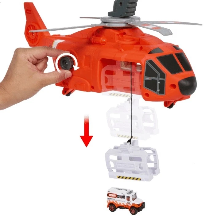 · Podleć na miejsce i zakręć dźwignią, aby opuścić wciągarkę, którą przyczepisz do pojazdu w skali 1:64. Unieś karetkę na pokład i kontynuuj misję.
