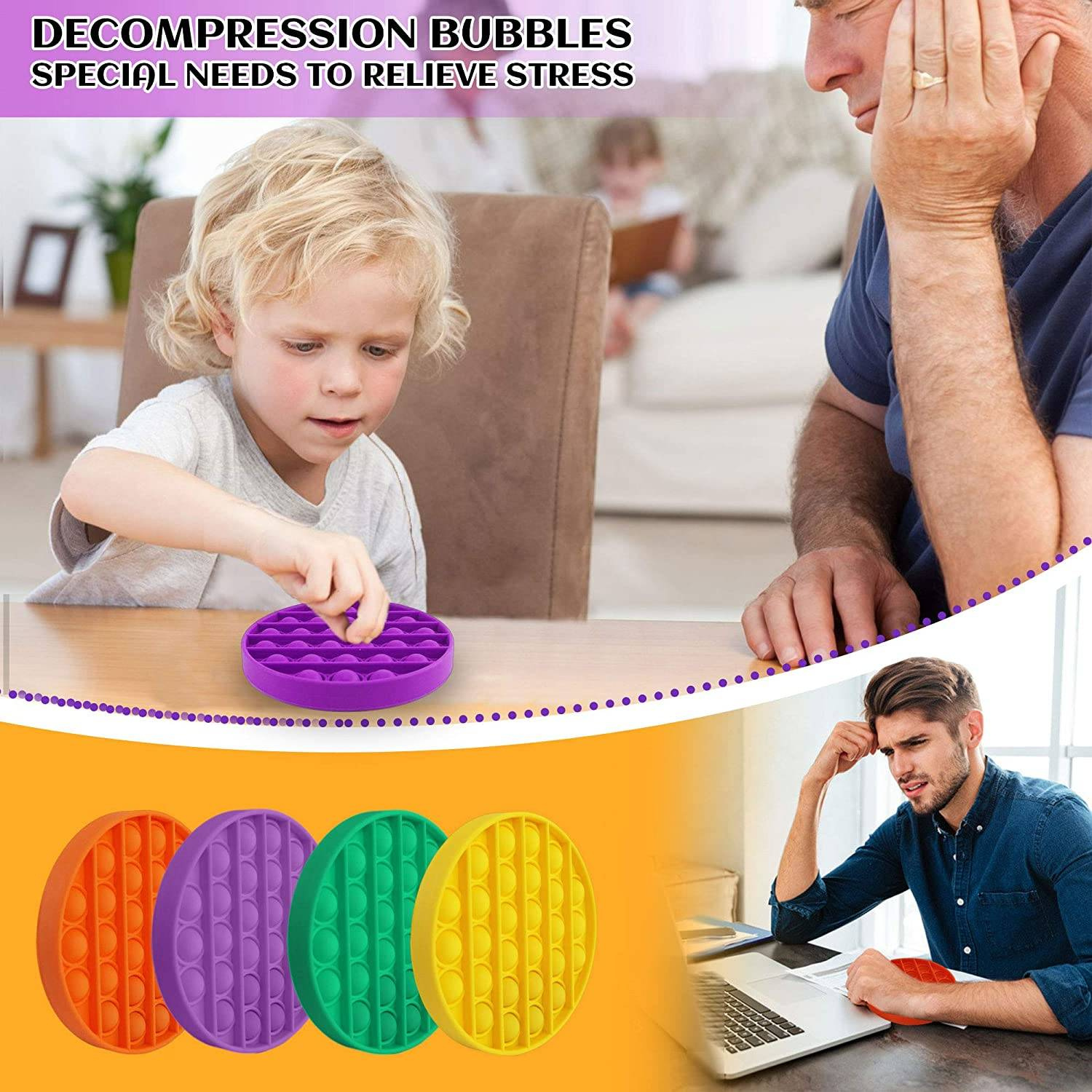 Push Bubble Fidget Wysokiej jakości zabawka sensoryczna wykonana z nieuczulającego silikonu. Daje tę niezwykłą satysfakcję, która towarzyszy dźwiękowi pękającego pęcherzyka powietrza. Dzięki zabawce sensorycznej doświadczysz uczucia odprężenia i rozluźnienia, które pozwala odreagować cały stres i wyciszyć emocje. Po wyciśnięciu całej powierzchni, wystarczy odwrócić zabawkę, aby dalej móc cieszyć się pstrykającymi bąbelkami powietrza. Jest całkowicie bezpieczna i nie uczula. Produkt o niewielkich rozmiarach, możesz go mieć zawsze przy sobie. Zmieści się w plecaku, torbie, torebce, a nawet w kieszeni.Zabawka jest całkowicie wodoodporna, więc jeśli zdarzy Ci się ją zabrudzić, bez większych przeszkód możesz ją umyć pod bieżącą wodą.