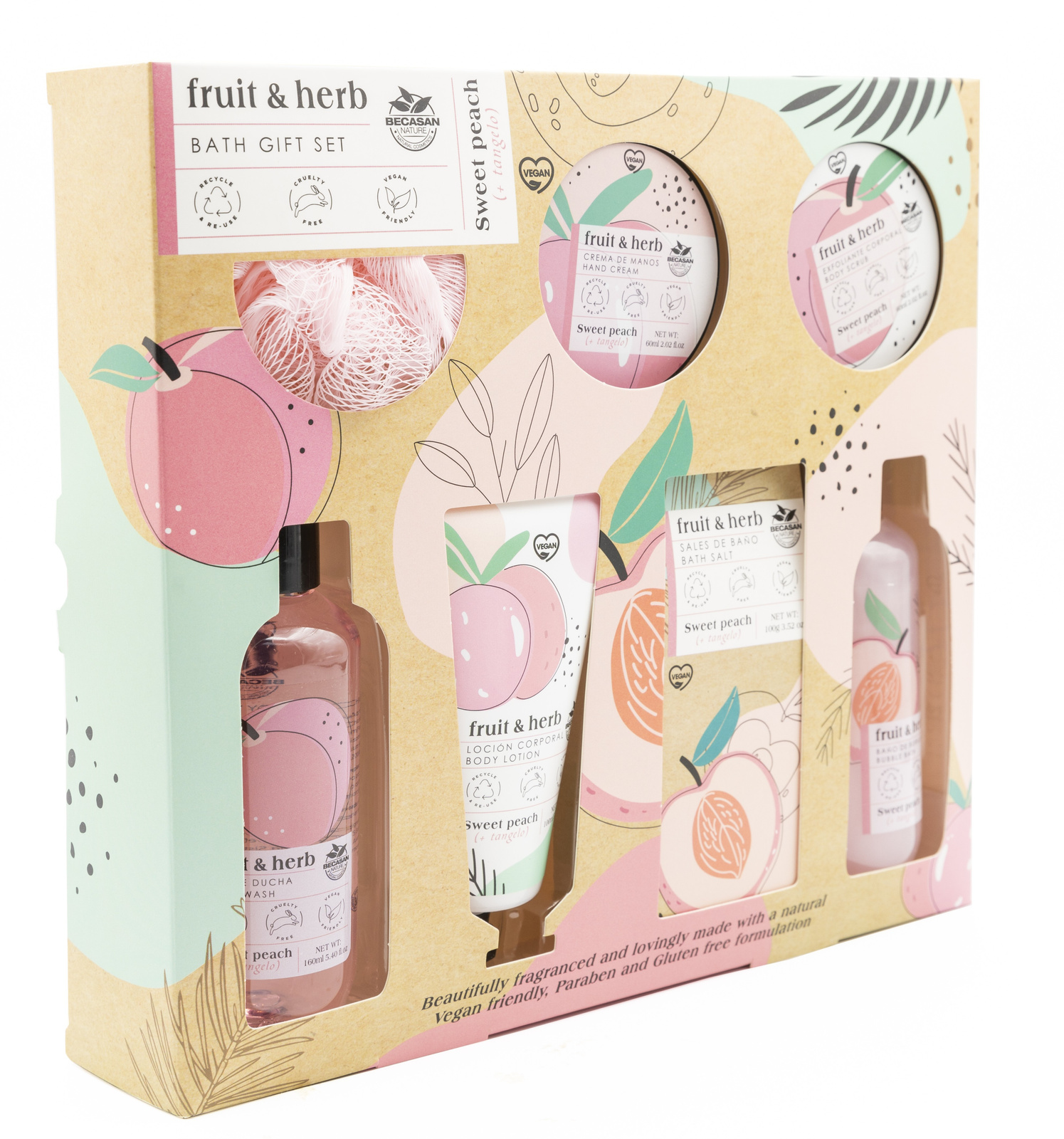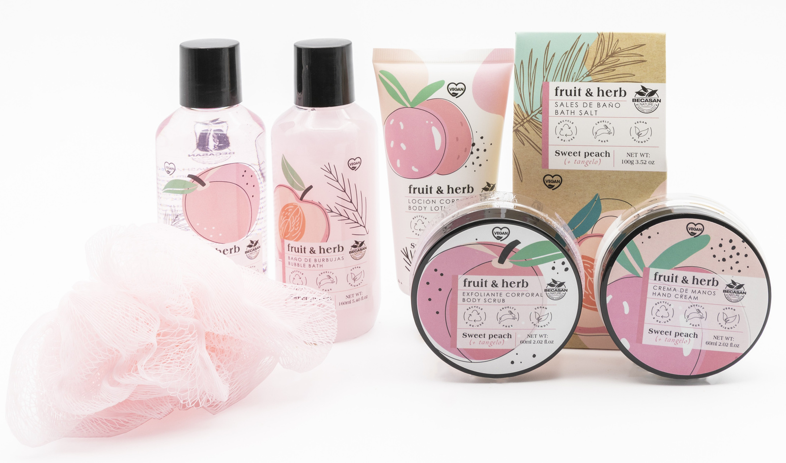 • Żel pod prysznic 160 ml • Pianka do mycia 160 ml • Balsam do ciała 100 ml • Peeling do ciała 60 ml • Krem do rąk 60 ml • Płyn do kąpieli 130 gr • Gąbka
