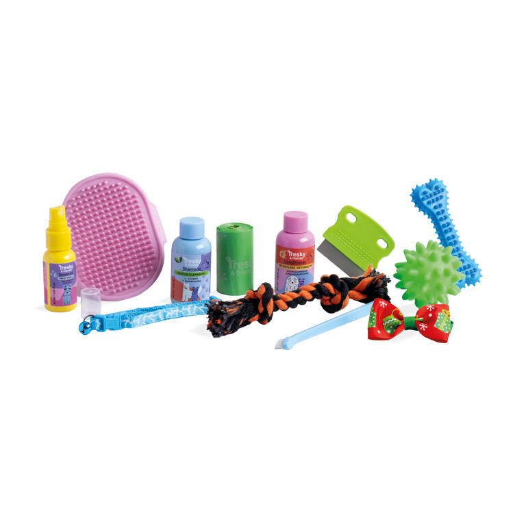 W zestawie: Szampon 50 ml ,Odżywka 30 ml ,Dezodorant w sprayu 30 ml ,Mała kulka ,Mała zabawka do gryzienia w kształcie kości ,Zabawka dla zwierząt, Szczotka ,Grzebień ,Rolka na woreczki na odchody, Muszki ,Obroża dla zwierząt.